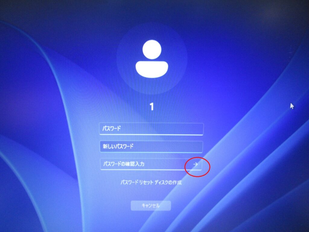 「パスワードの確認入力」欄にある右矢印をクリックするか、上記画面でEnterキーを数回押すとパスワードを設定せずにログイン可能です。
