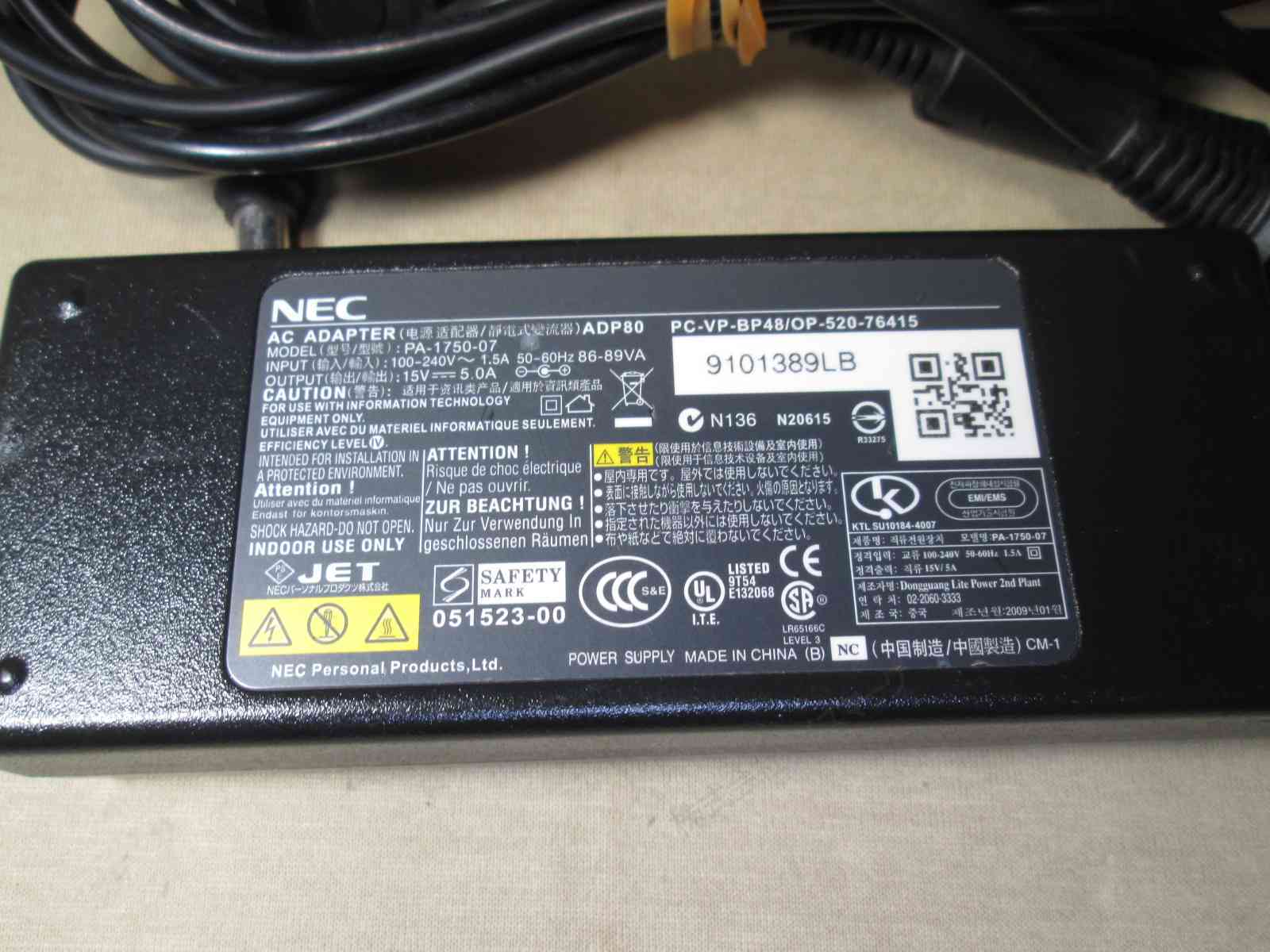 ACアダプター NEC PC-VPBP48 15V 5A 正常品 [93767]