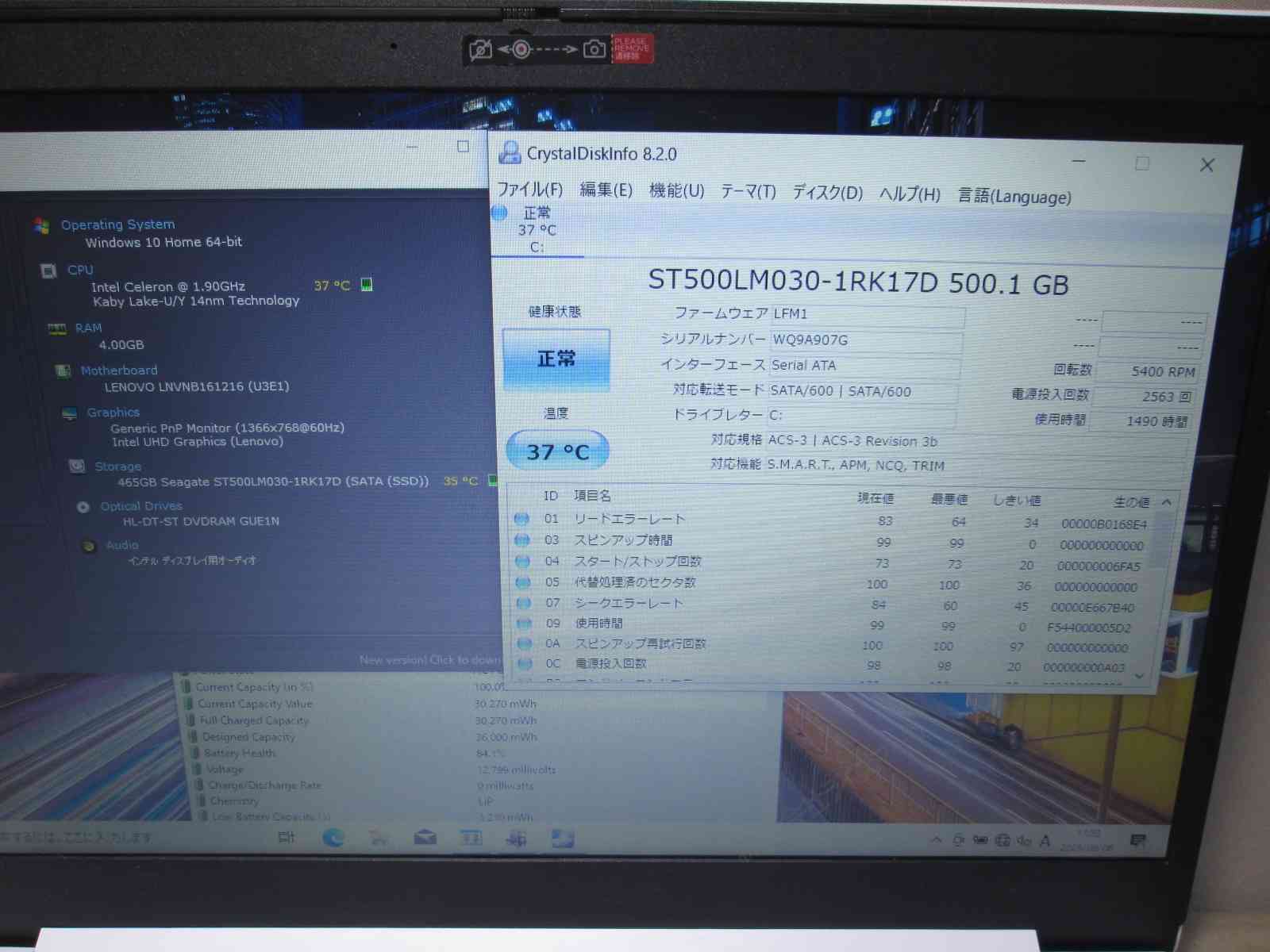 | バッテリー状態 | 新品時と比較して 84% の性能。 (BatteryInfoViewで表示された参考値であり実際の容量・充電可否は保証対象外) |