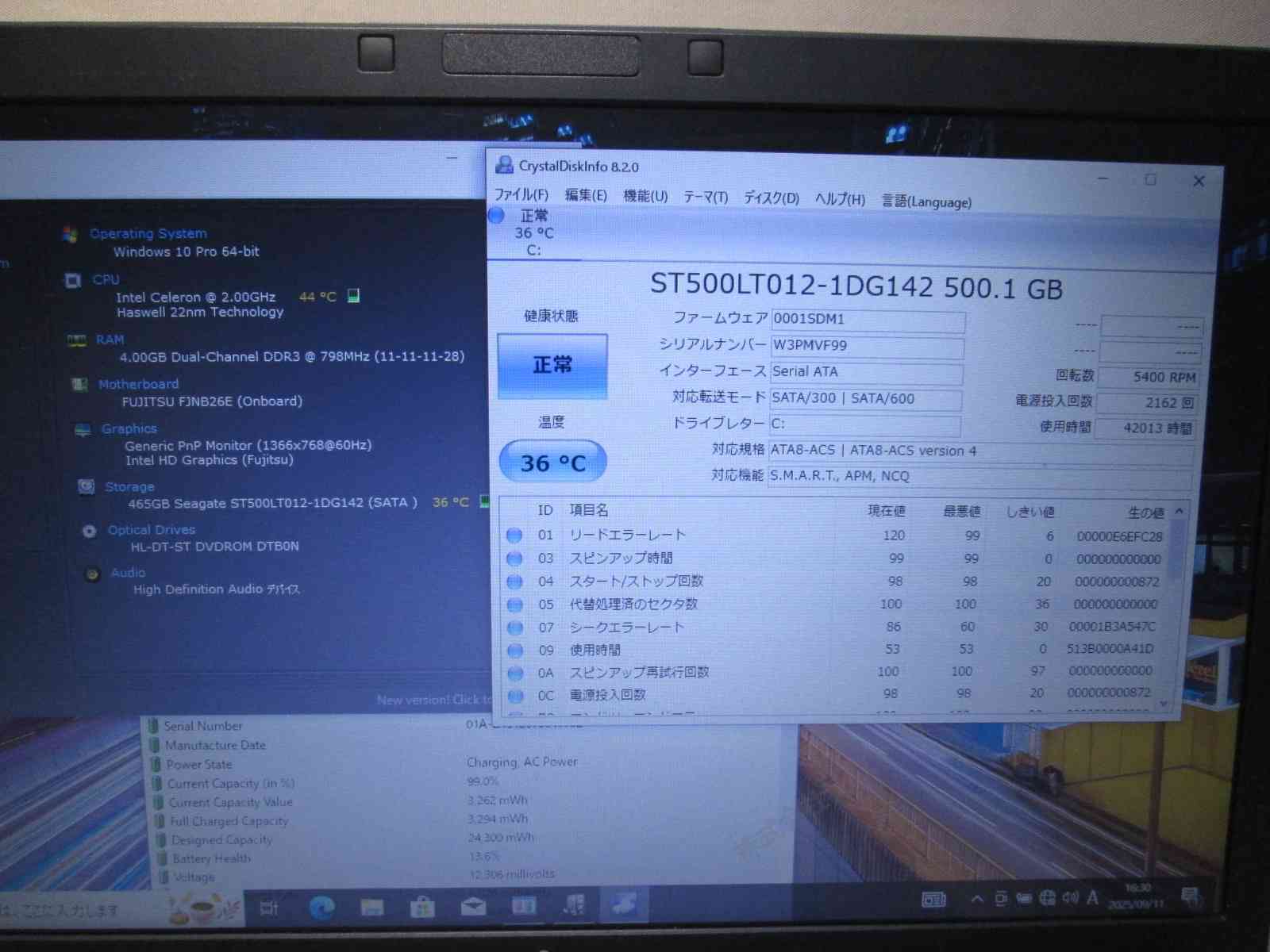 | バッテリー状態 | 新品時と比較して 13% の性能。 (BatteryInfoViewで表示された参考値であり実際の容量・充電可否は保証対象外) |