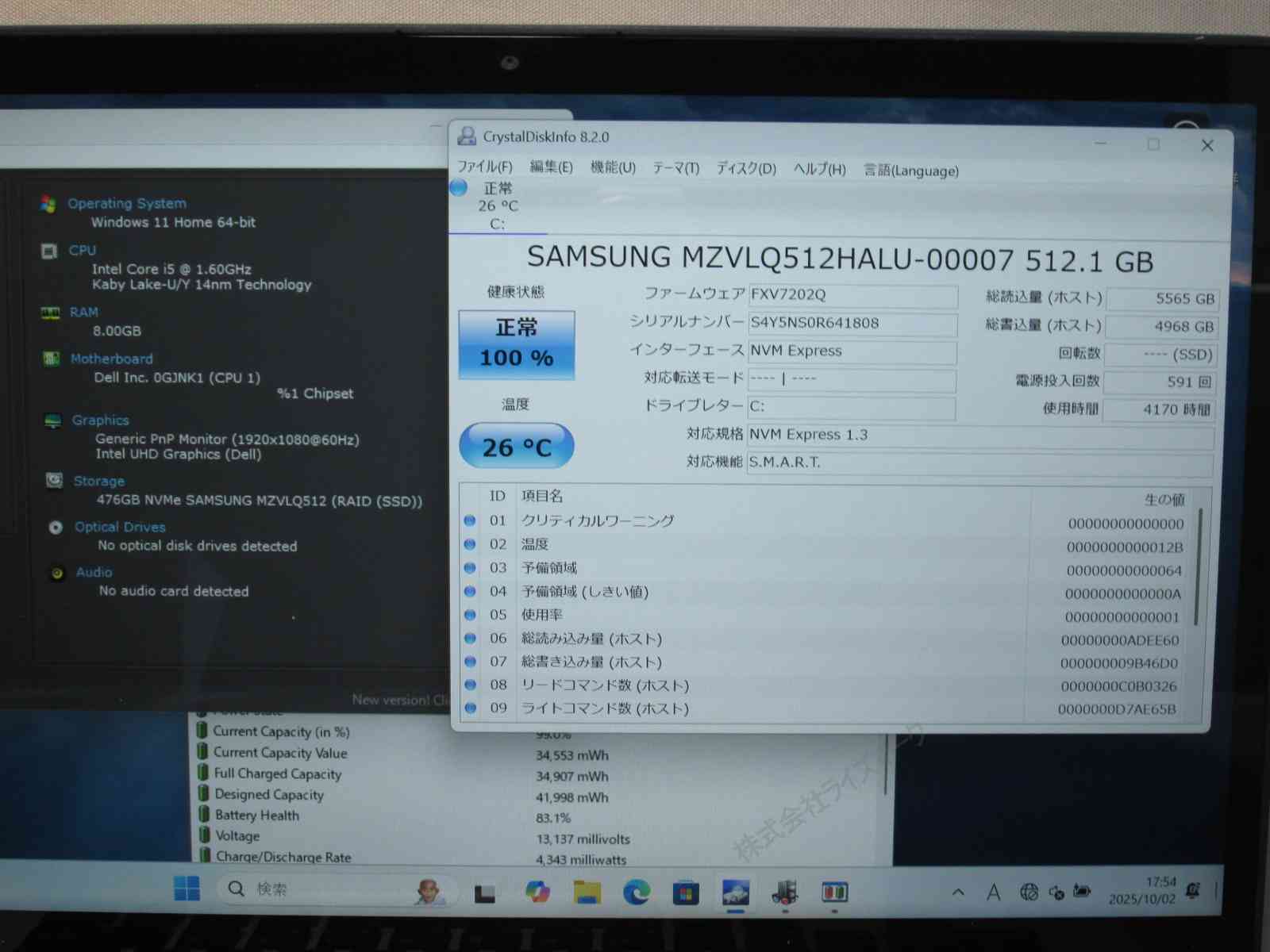 | バッテリー状態 | 新品時と比較して 83% の性能。 (BatteryInfoViewで表示された参考値であり実際の容量・充電可否は保証対象外) |