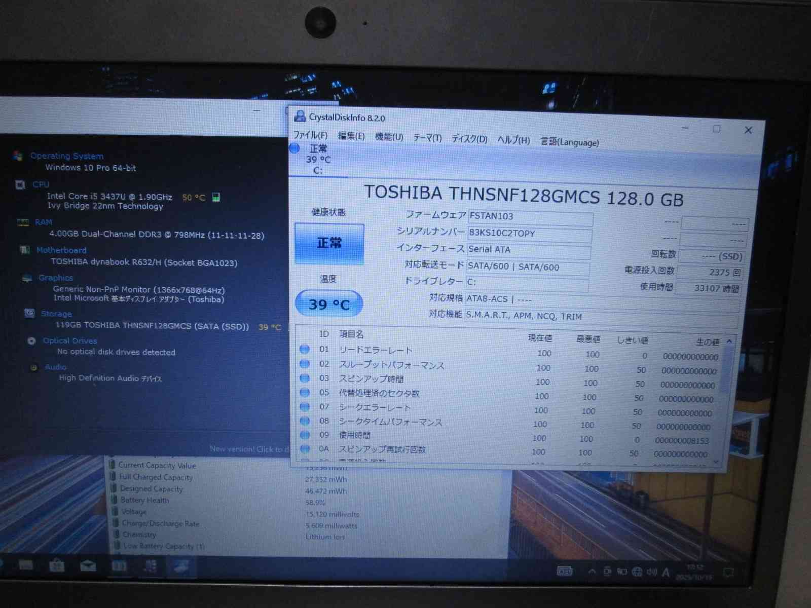 | バッテリー状態 | 新品時と比較して 58% の性能。 (BatteryInfoViewで表示された参考値であり実際の容量・充電可否は保証対象外) |