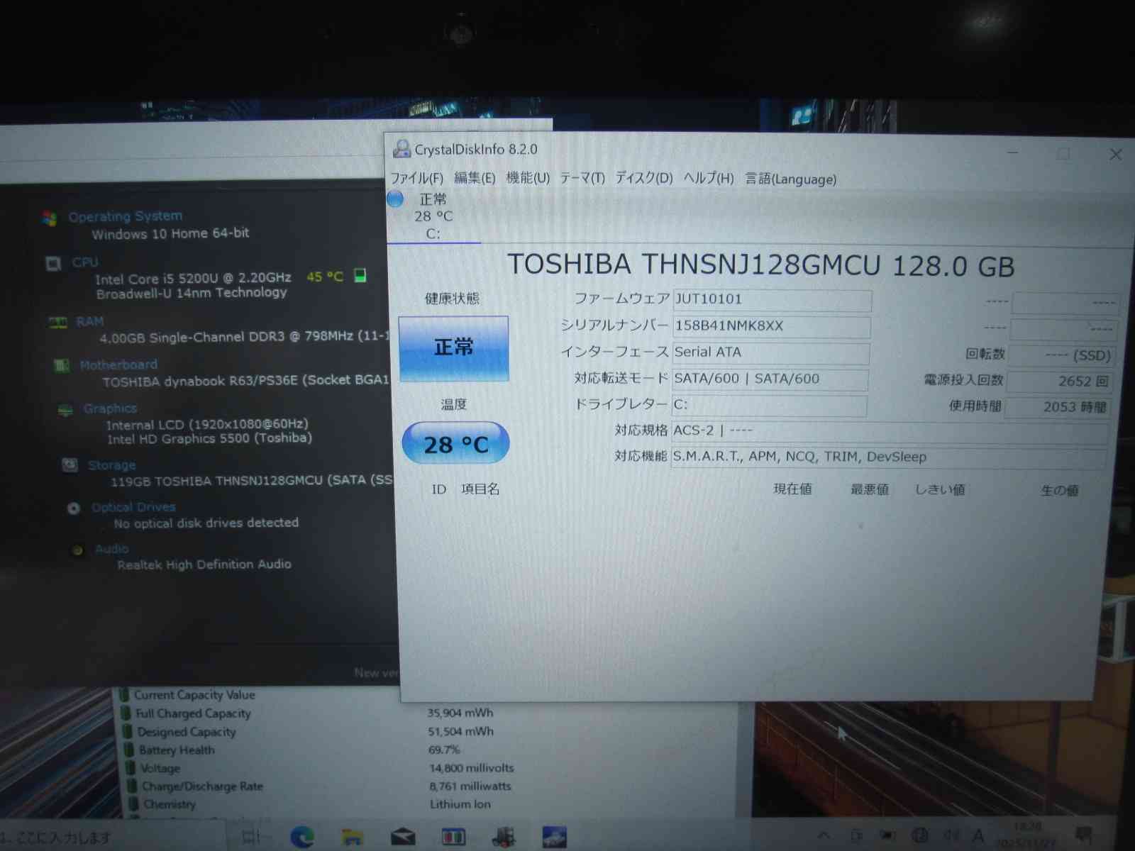 | バッテリー状態 | 新品時と比較して 69% の性能。 (BatteryInfoViewで表示された参考値であり実際の容量・充電可否は保証対象外) |