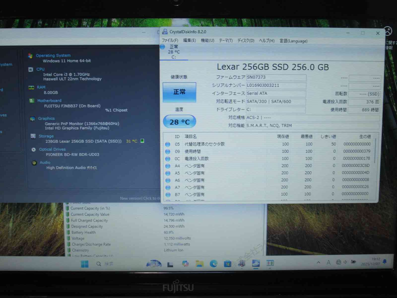 | バッテリー状態 | 新品時と比較して 60% の性能。 (BatteryInfoViewで表示された参考値であり実際の容量・充電可否は保証対象外) |