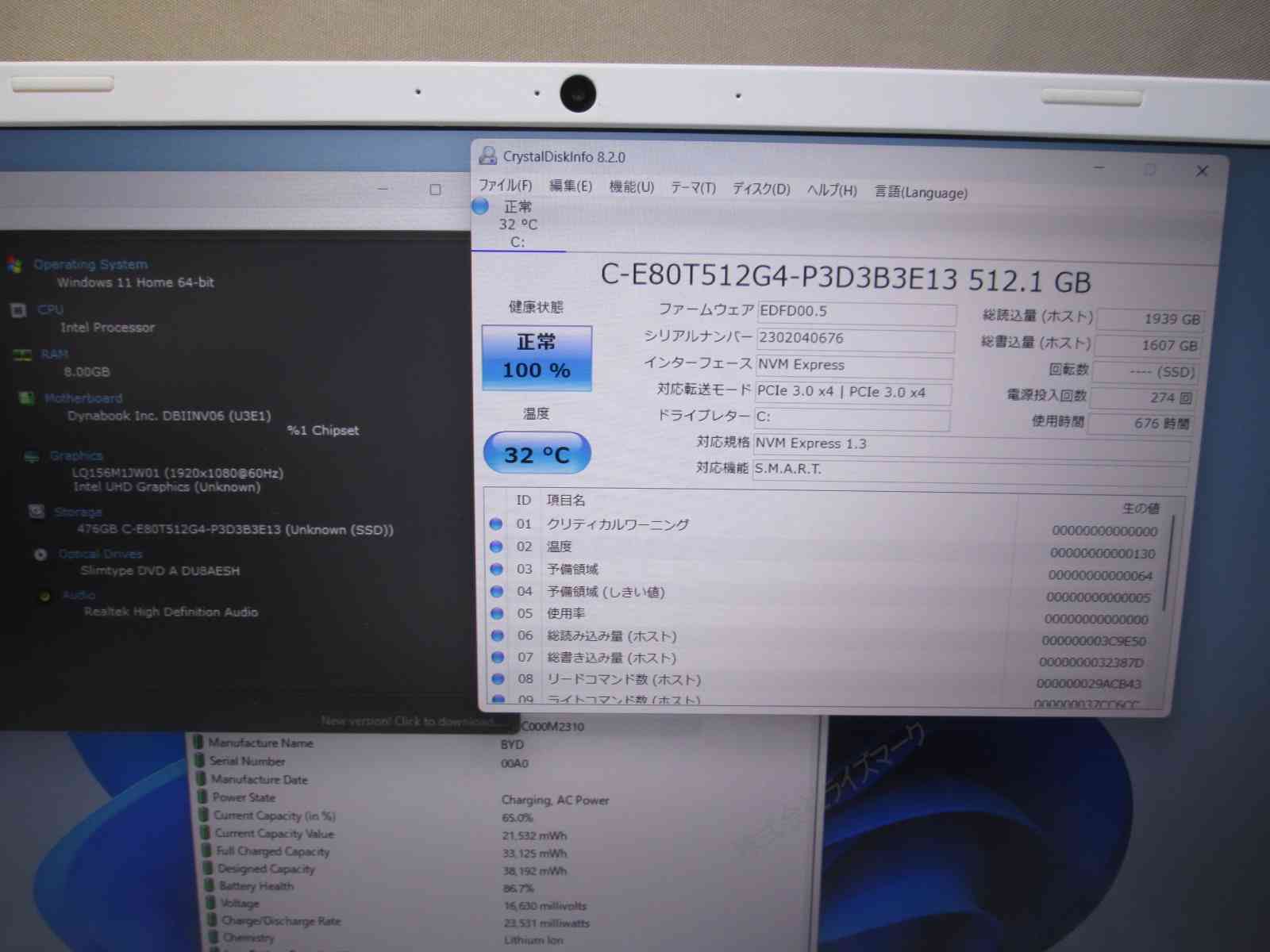 | バッテリー状態 | 新品時と比較して 86% の性能。 (BatteryInfoViewで表示された参考値であり実際の容量・充電可否は保証対象外) |