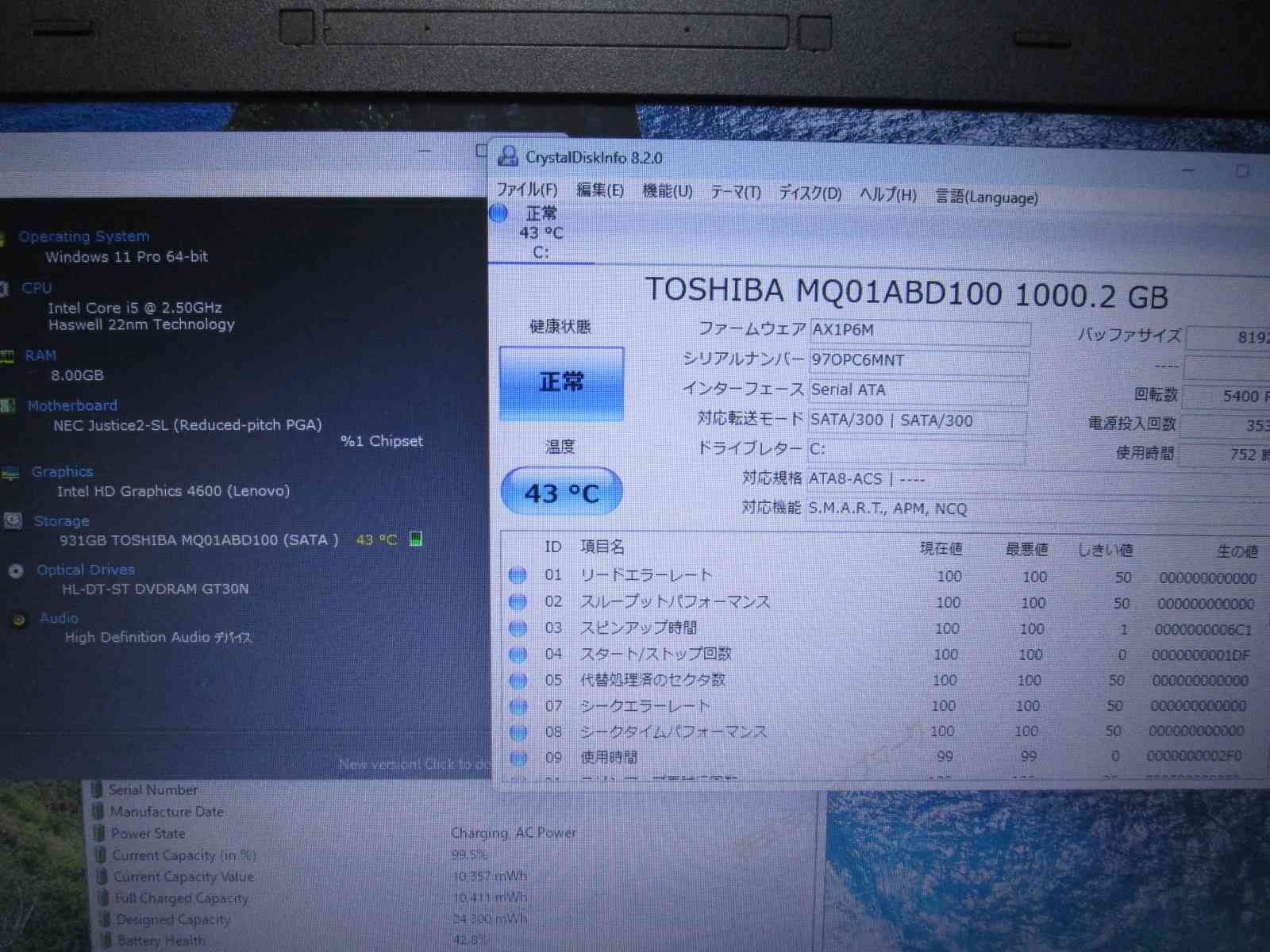 | バッテリー状態 | 新品時と比較して 42% の性能。 (BatteryInfoViewで表示された参考値であり実際の容量・充電可否は保証対象外) |