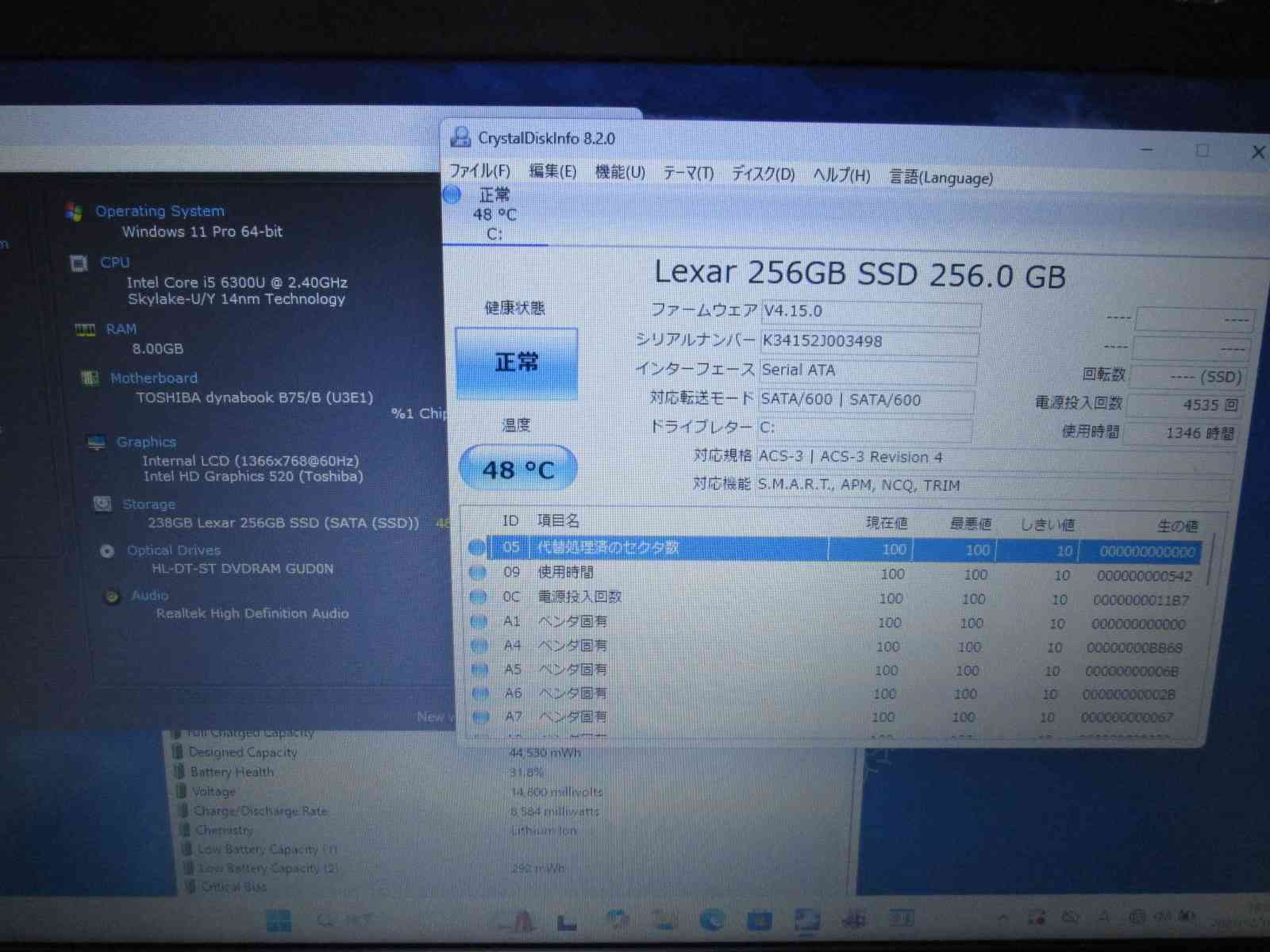 | バッテリー状態 | 新品時と比較して 31% の性能。 (BatteryInfoViewで表示された参考値であり実際の容量・充電可否は保証対象外) |