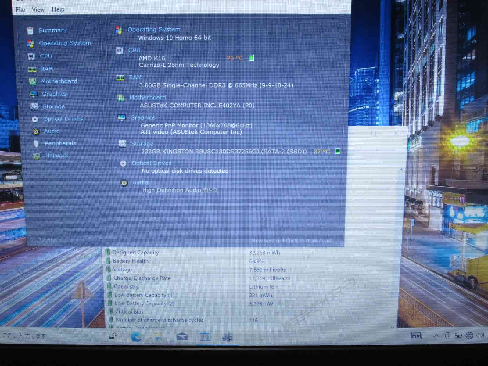 | バッテリー状態 | 新品時と比較して 64% の性能。 (BatteryInfoViewで表示された参考値であり実際の容量・充電可否は保証対象外) |