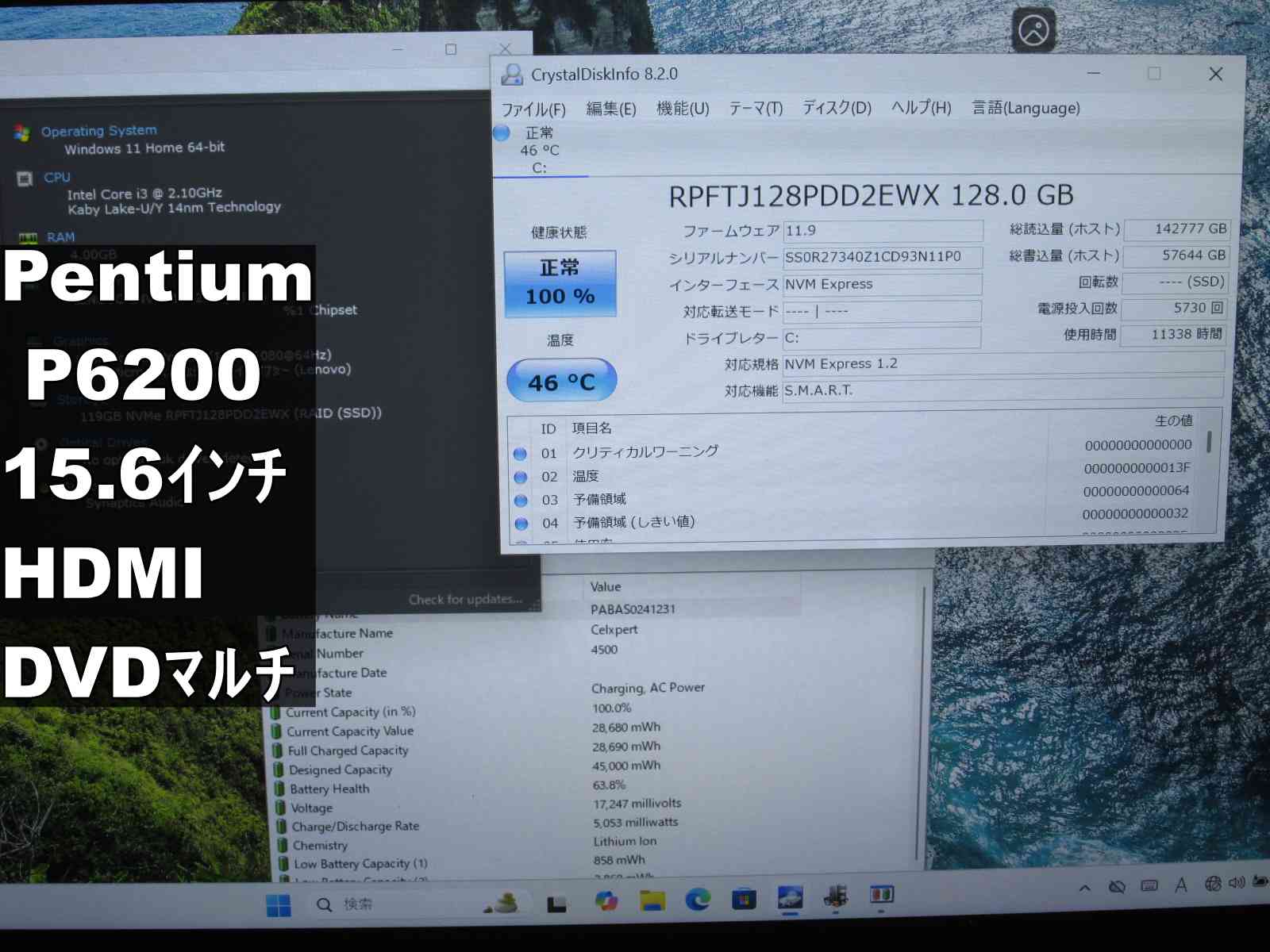 | バッテリー状態 | 新品時と比較して 63% の性能。 (BatteryInfoViewで表示された参考値であり実際の容量・充電可否は保証対象外) |