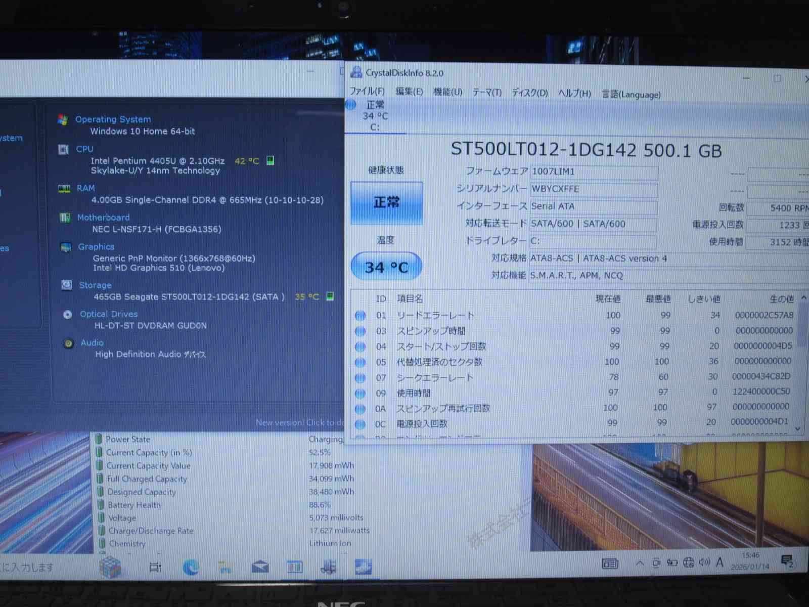 | バッテリー状態 | 新品時と比較して 88% の性能。 (BatteryInfoViewで表示された参考値であり実際の容量・充電可否は保証対象外) |