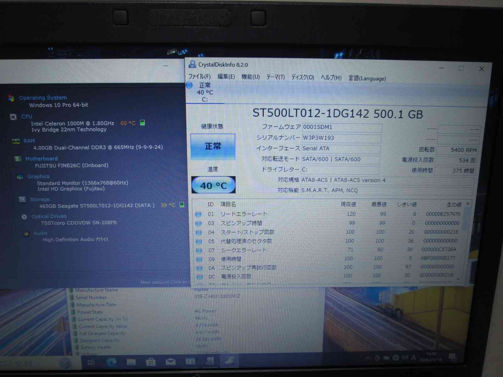 | バッテリー状態 | 新品時と比較して 19% の性能。 (BatteryInfoViewで表示された参考値であり実際の容量・充電可否は保証対象外) |