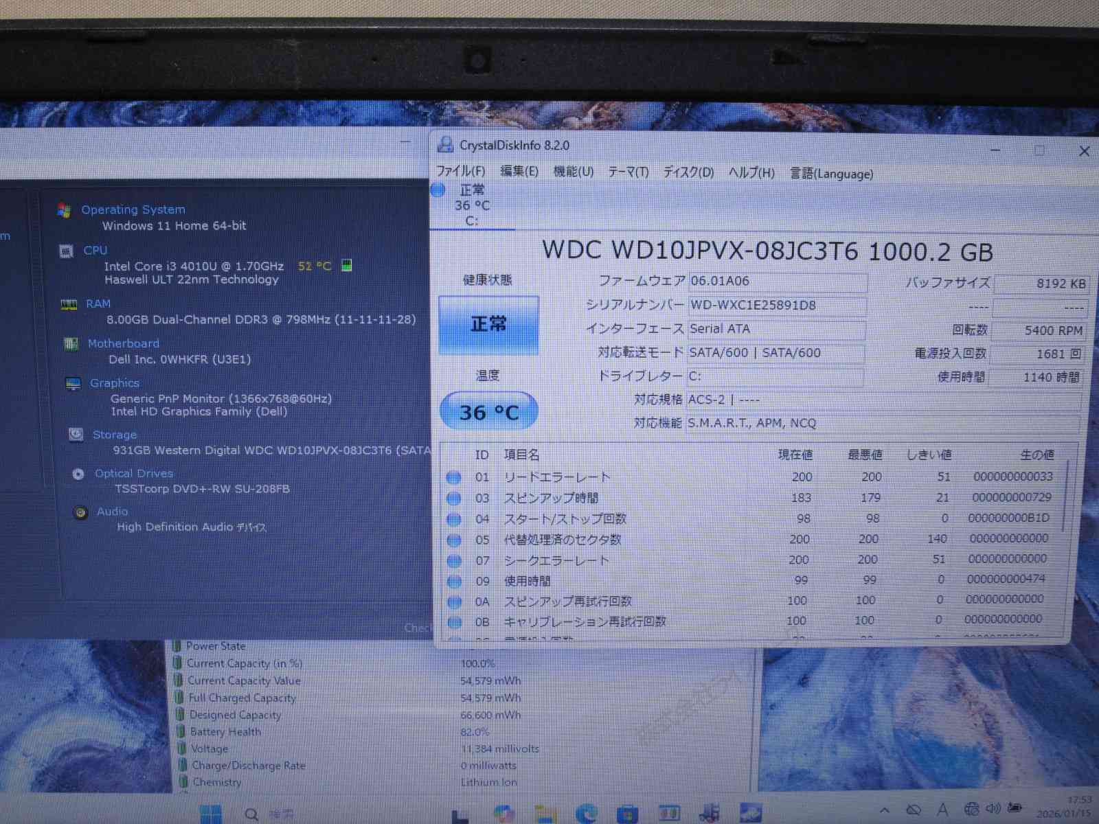 | バッテリー状態 | 新品時と比較して 82% の性能。 (BatteryInfoViewで表示された参考値であり実際の容量・充電可否は保証対象外) |