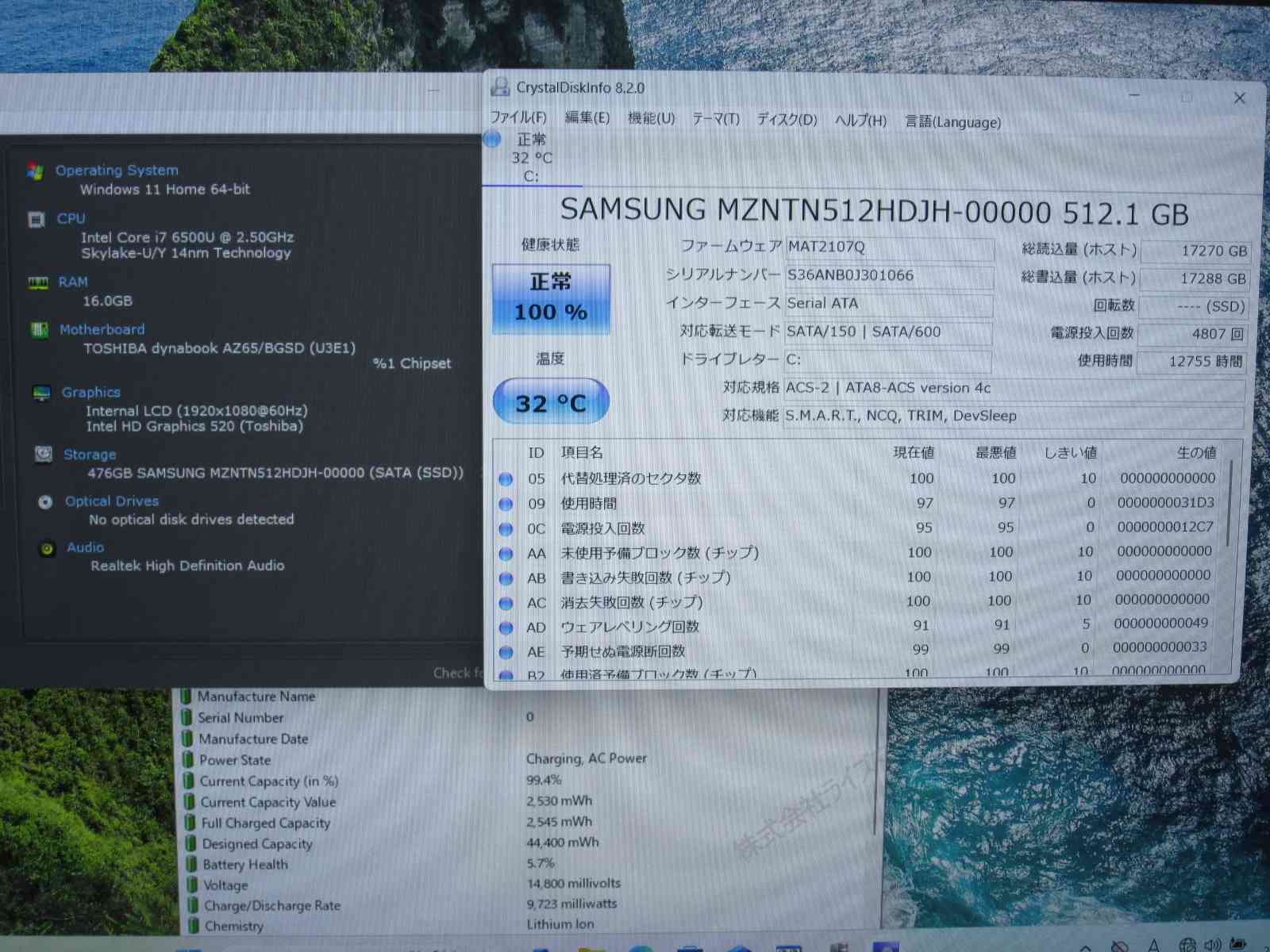 | バッテリー状態 | 新品時と比較して 5% の性能。 (BatteryInfoViewで表示された参考値であり実際の容量・充電可否は保証対象外) |