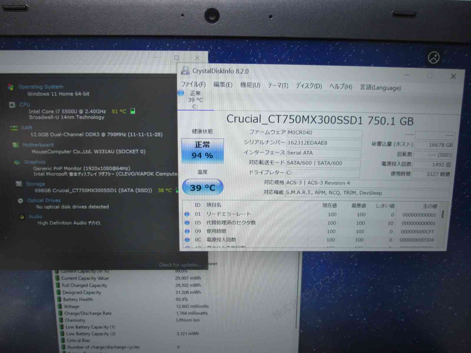 | バッテリー状態 | 新品時と比較して 93% の性能。 (BatteryInfoViewで表示された参考値であり実際の容量・充電可否は保証対象外) |