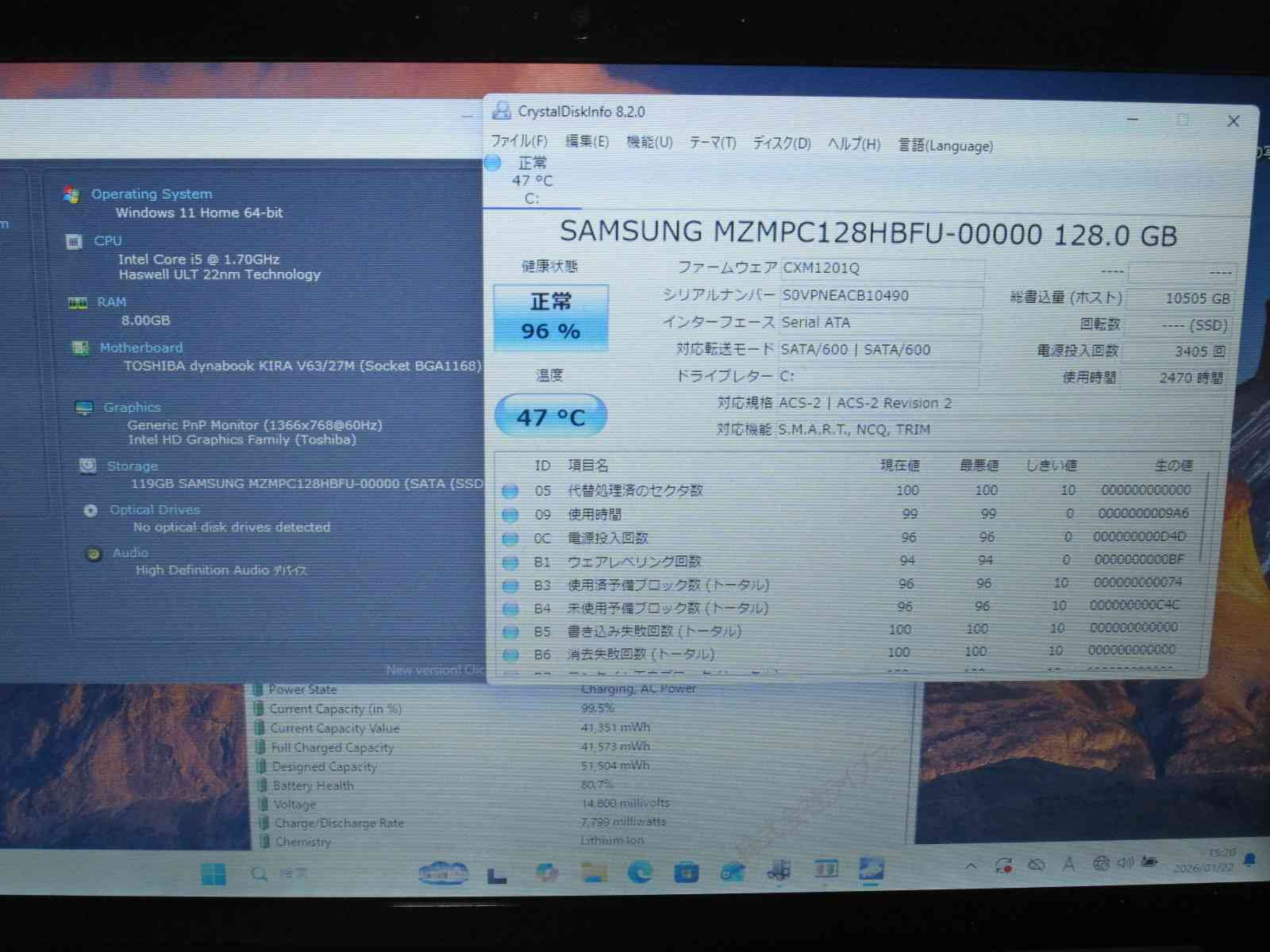 | バッテリー状態 | 新品時と比較して 80% の性能。 (BatteryInfoViewで表示された参考値であり実際の容量・充電可否は保証対象外) |