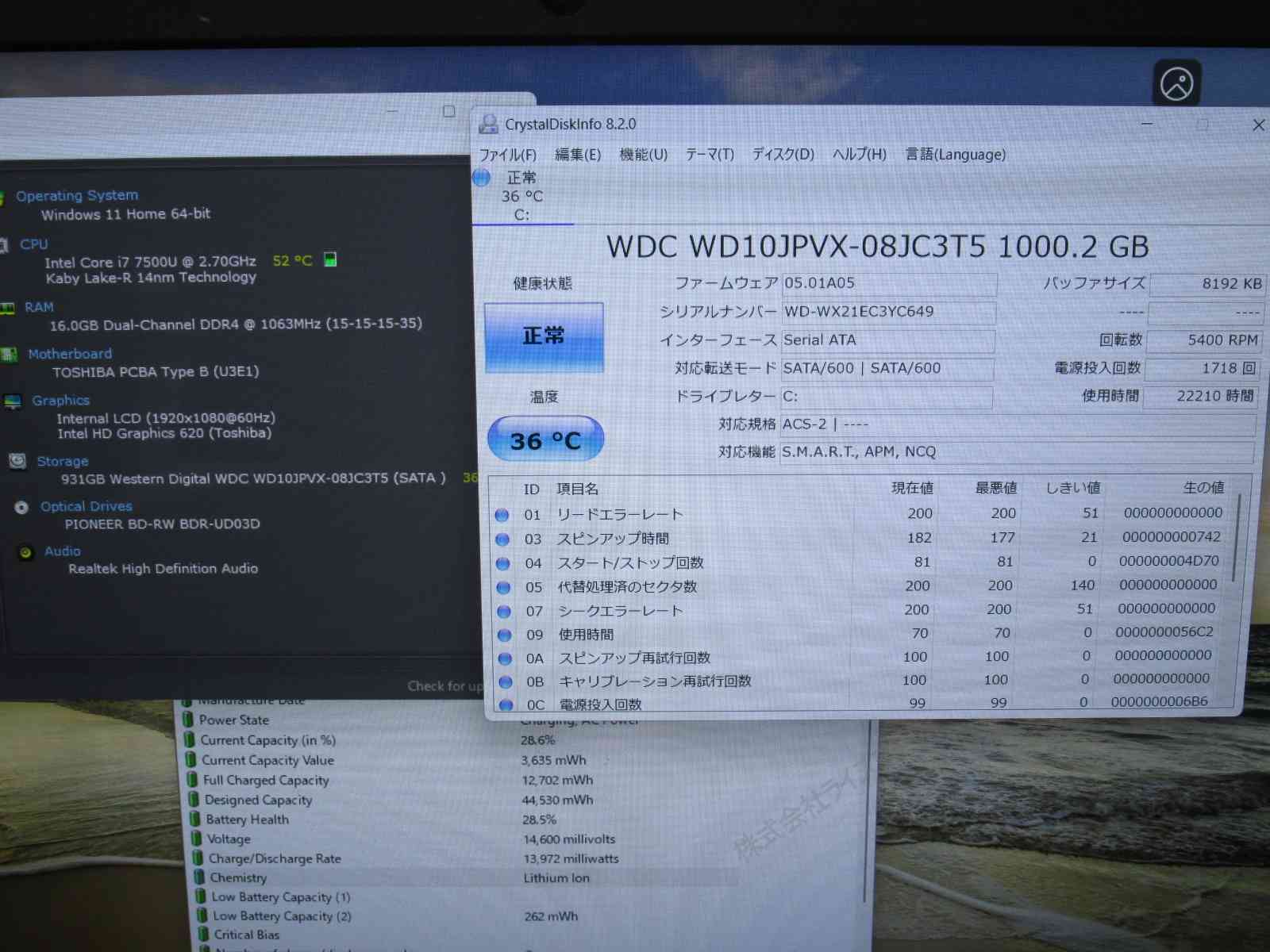 | バッテリー状態 | 新品時と比較して 28% の性能。 (BatteryInfoViewで表示された参考値であり実際の容量・充電可否は保証対象外) |