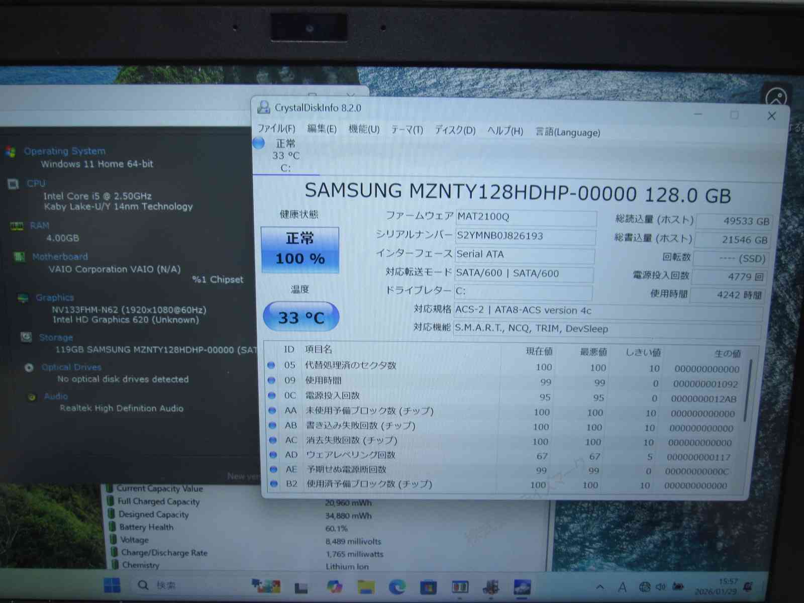 | バッテリー状態 | 新品時と比較して 60% の性能。 (BatteryInfoViewで表示された参考値であり実際の容量・充電可否は保証対象外) |