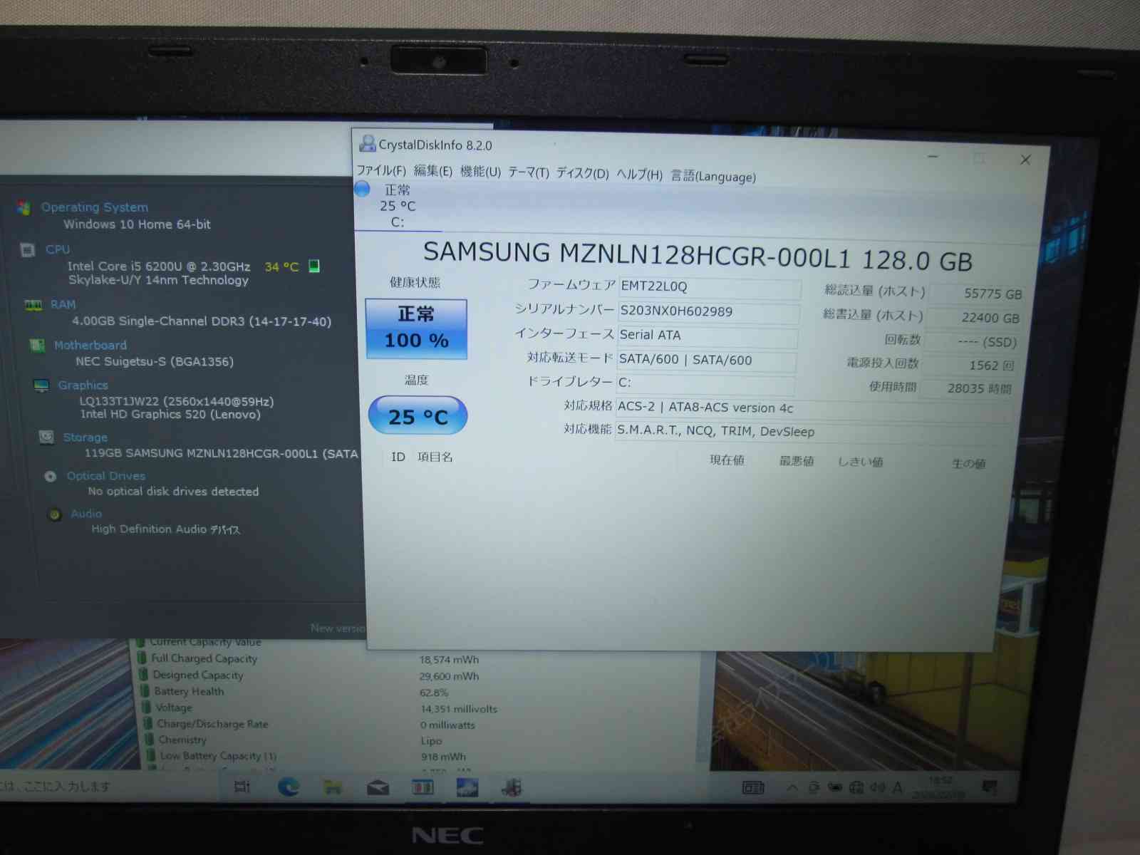 | バッテリー状態 | 新品時と比較して 62% の性能。 (BatteryInfoViewで表示された参考値であり実際の容量・充電可否は保証対象外) |