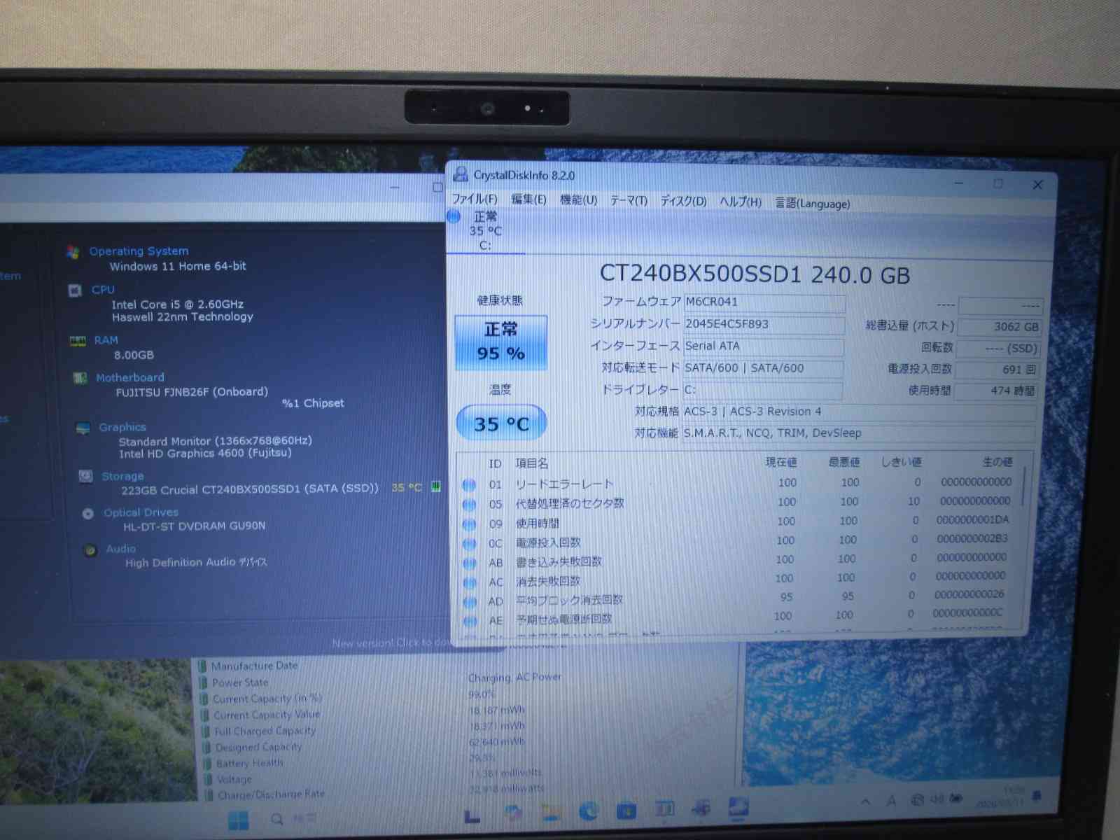 | バッテリー状態 | 新品時と比較して 29% の性能。 (BatteryInfoViewで表示された参考値であり実際の容量・充電可否は保証対象外) |