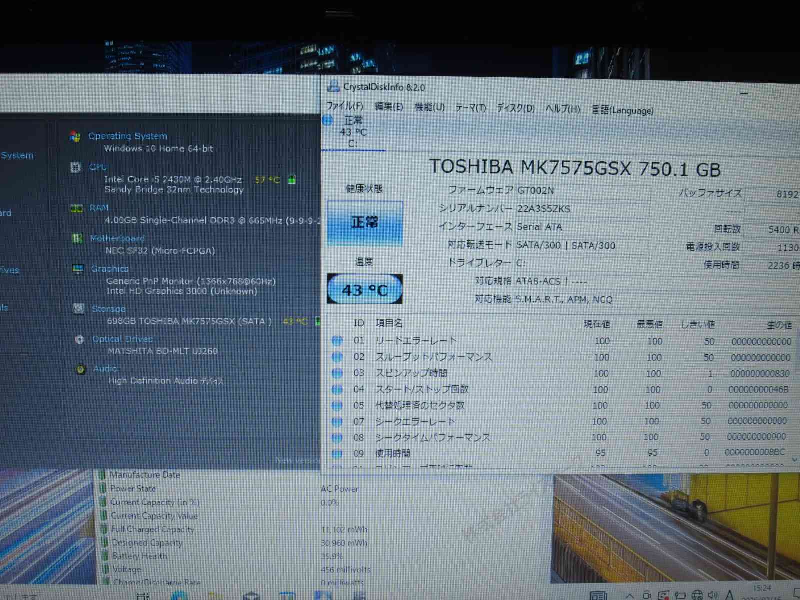 | CPU | Core i5 2430M 2.4GHz |