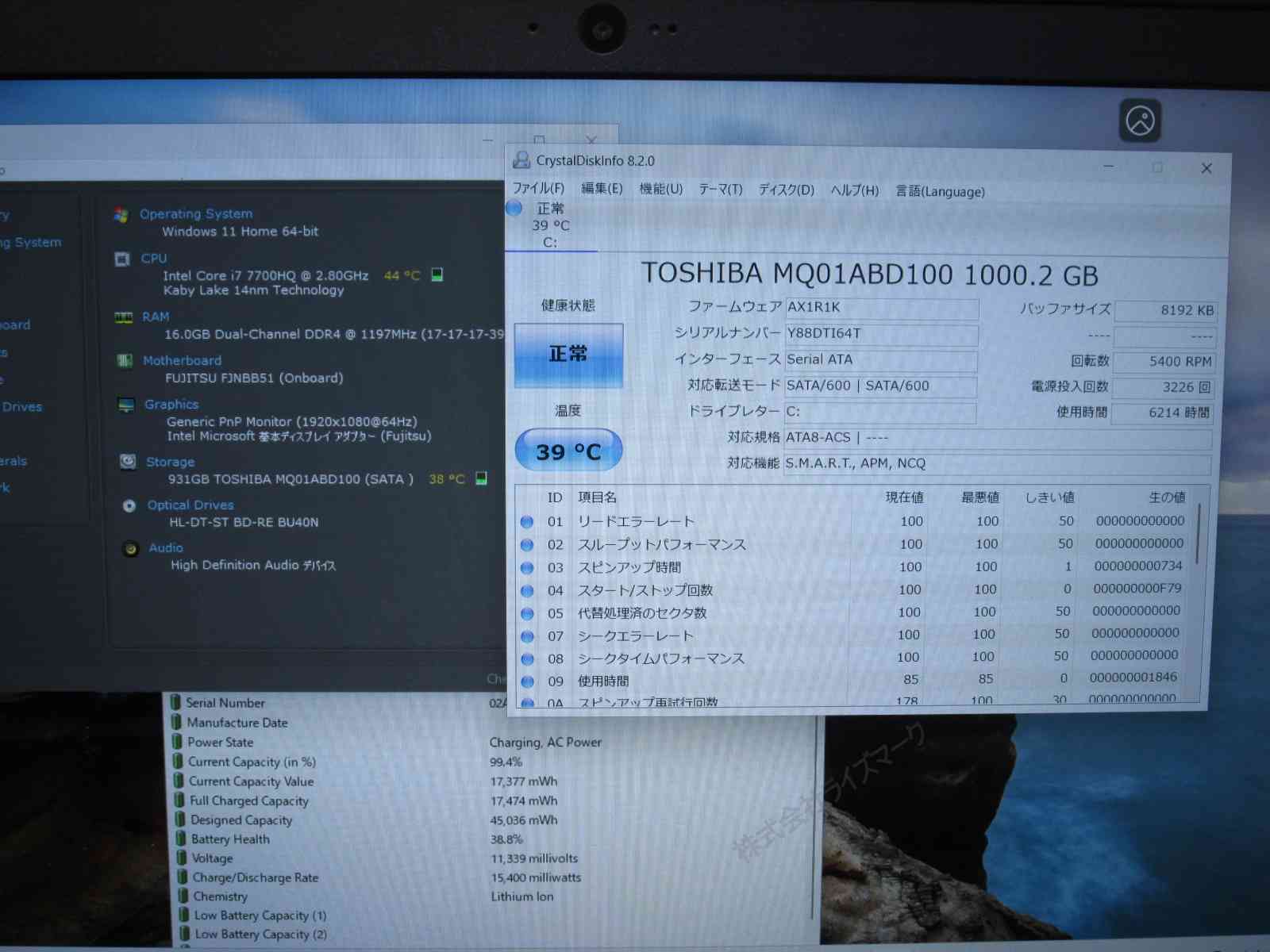 | バッテリー状態 | 新品時と比較して 38% の性能。 (BatteryInfoViewで表示された参考値であり実際の容量・充電可否は保証対象外) |