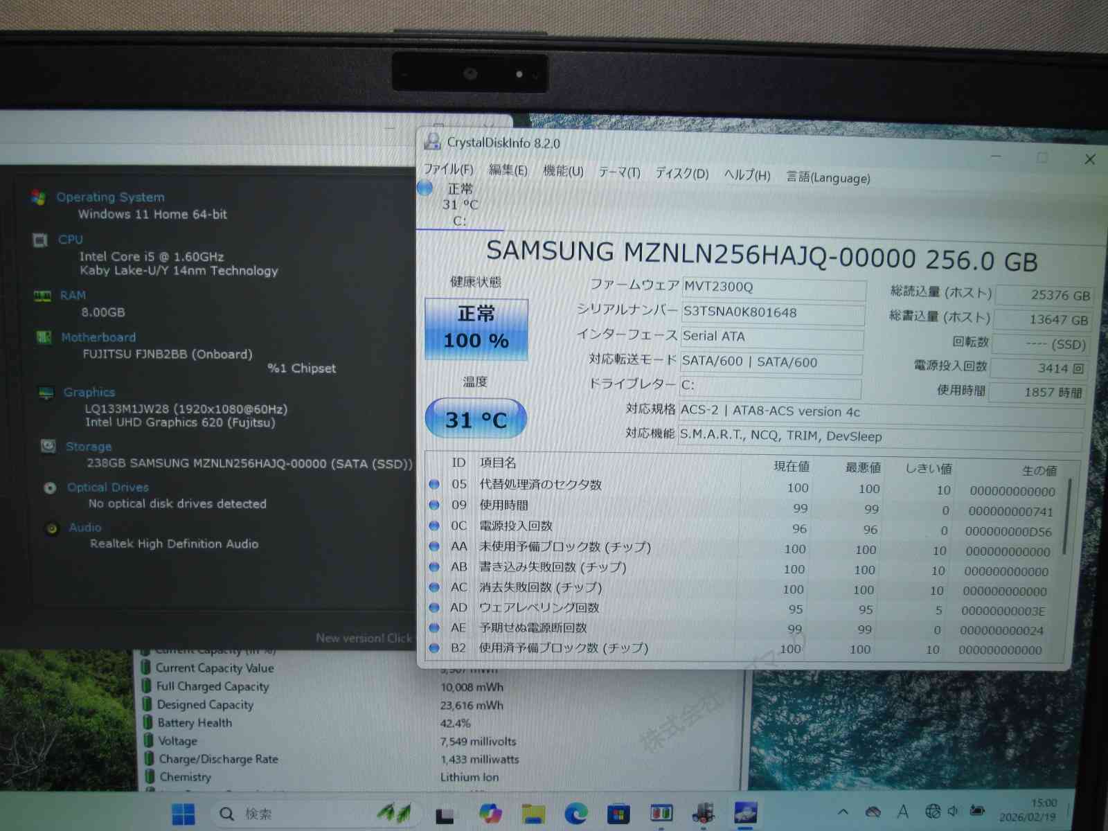 | バッテリー状態 | 新品時と比較して 42% の性能。 (BatteryInfoViewで表示された参考値であり実際の容量・充電可否は保証対象外) |