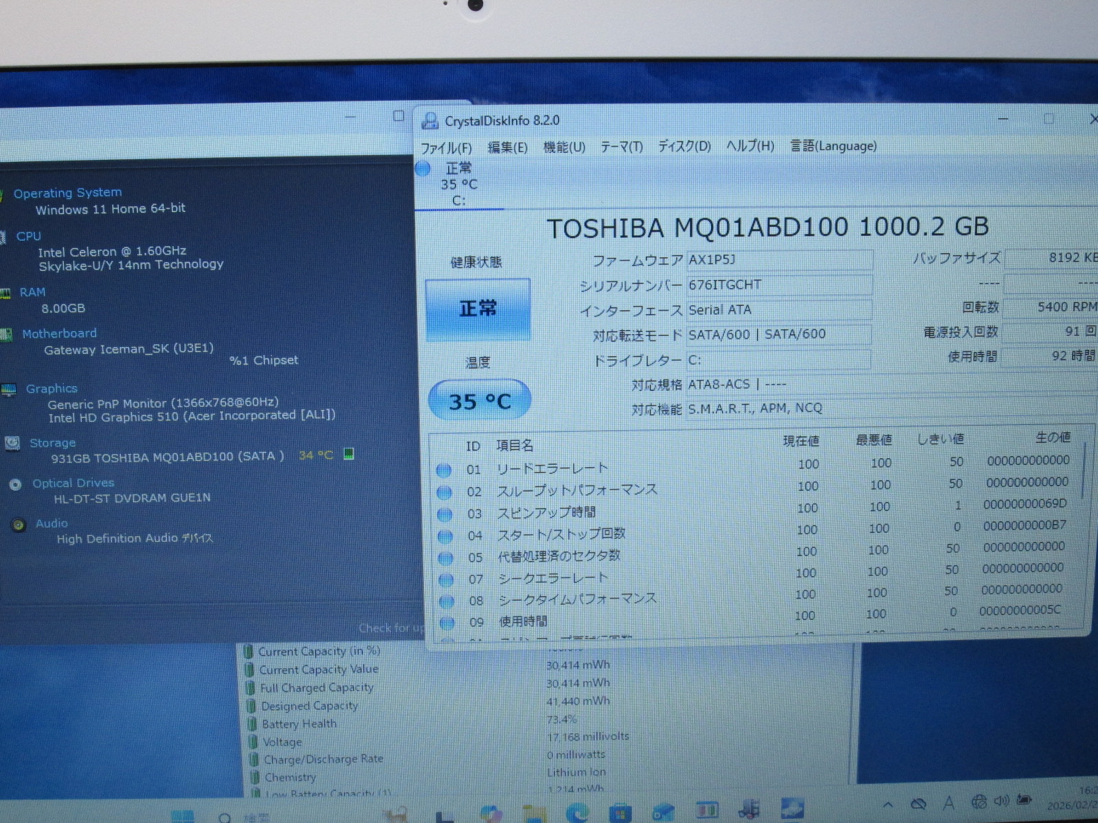 | バッテリー状態 | 新品時と比較して 73% の性能。 (BatteryInfoViewで表示された参考値であり実際の容量・充電可否は保証対象外) |