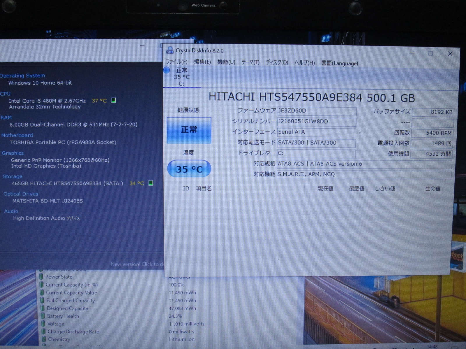 | バッテリー状態 | 新品時と比較して 24% の性能。 (BatteryInfoViewで表示された参考値であり実際の容量・充電可否は保証対象外) |