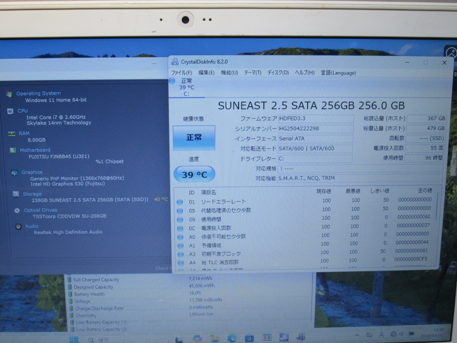 | バッテリー状態 | 新品時と比較して 16% の性能。 (BatteryInfoViewで表示された参考値であり実際の容量・充電可否は保証対象外) |