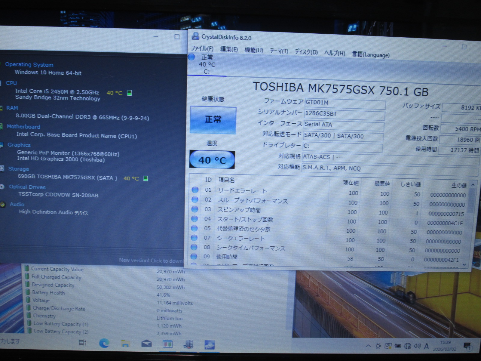 | バッテリー状態 | 新品時と比較して 41% の性能。 (BatteryInfoViewで表示された参考値であり実際の容量・充電可否は保証対象外) |