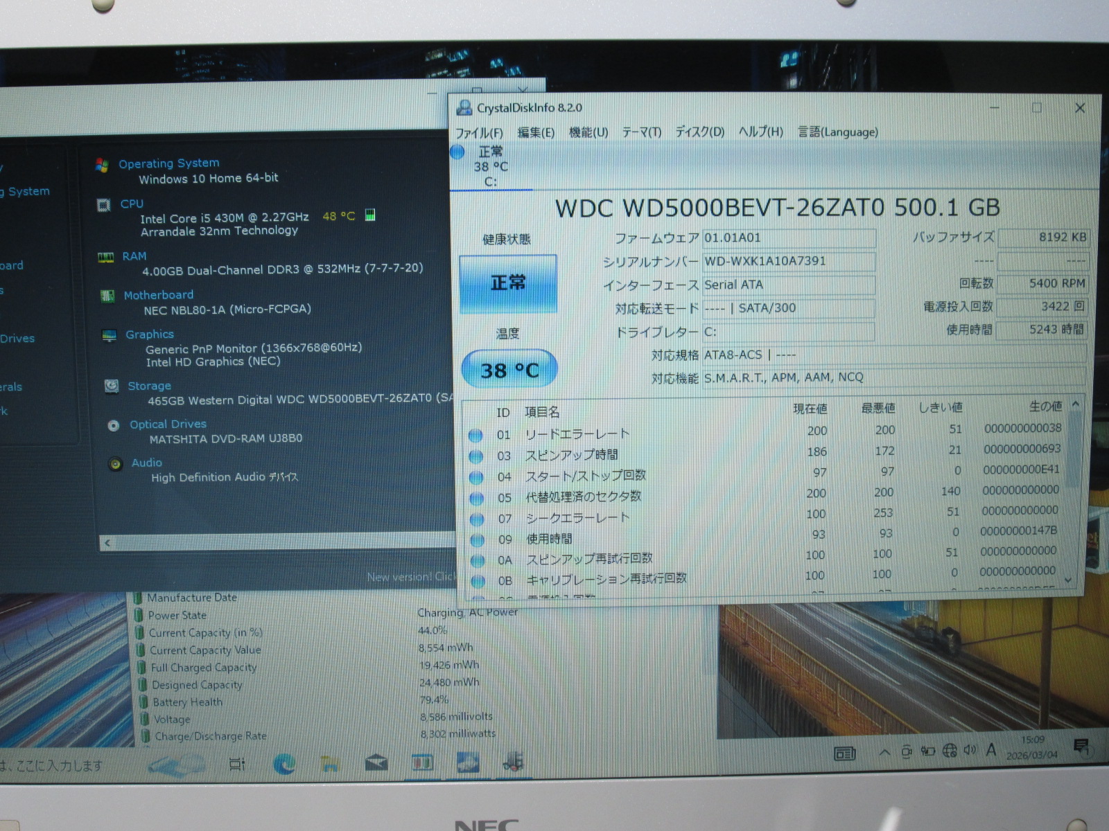 | バッテリー状態 | 新品時と比較して 79% の性能。 (BatteryInfoViewで表示された参考値であり実際の容量・充電可否は保証対象外) |