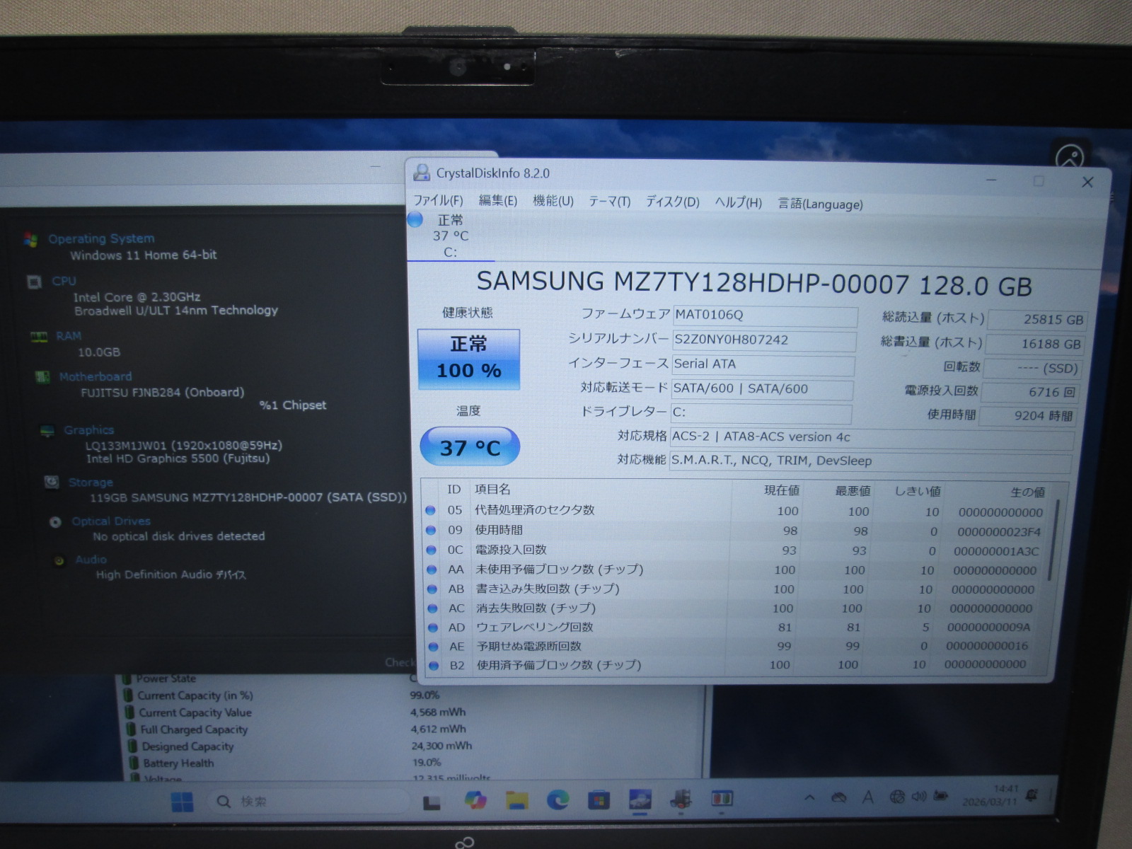 | バッテリー状態 | 新品時と比較して 19% の性能。 (BatteryInfoViewで表示された参考値であり実際の容量・充電可否は保証対象外) |