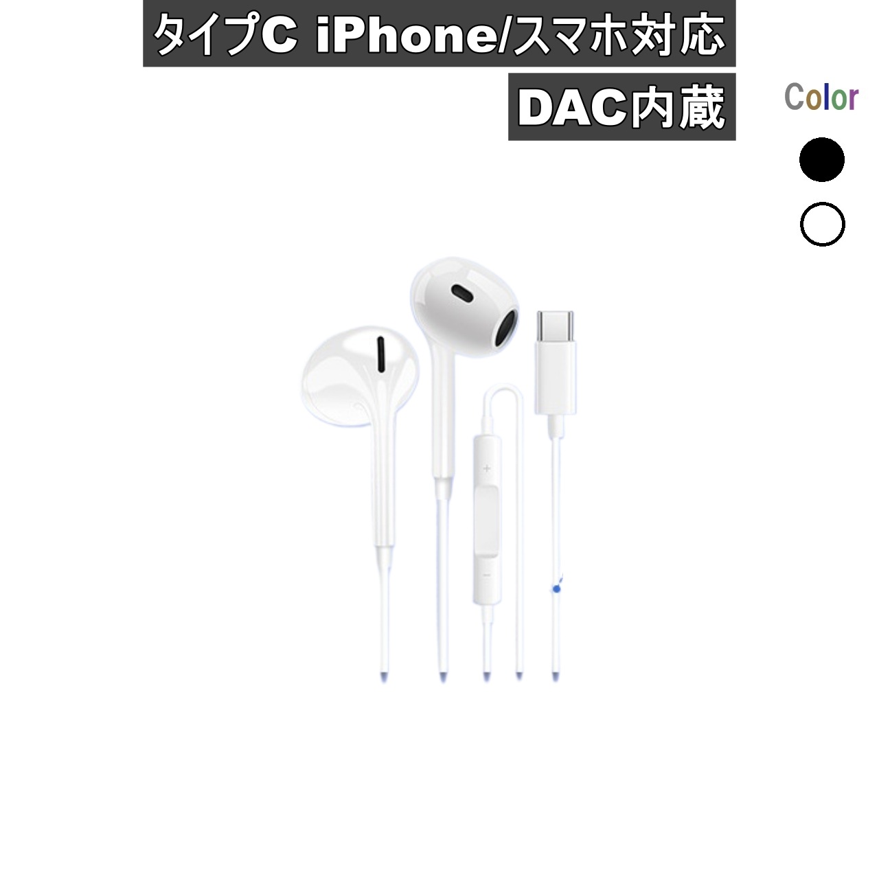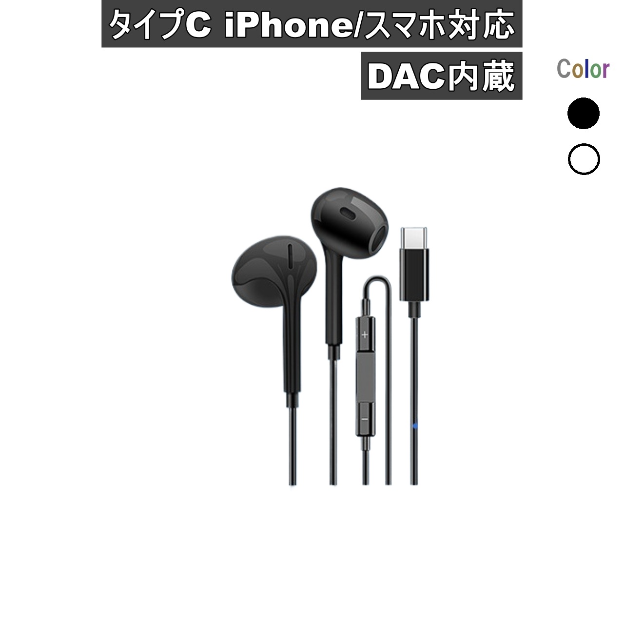 | 商品名 | イヤホン USBタイプC接続 iPhone/Android対応 DAC内蔵 シンプル ブラック 有線イヤホン |