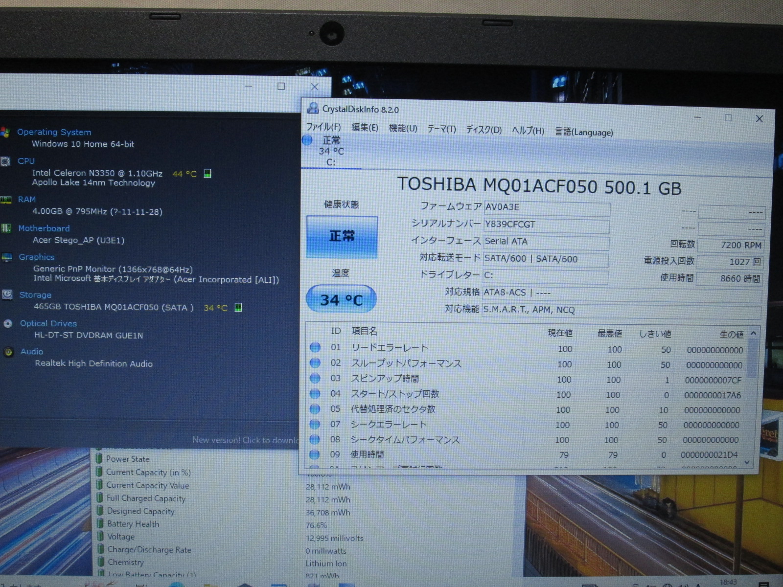 | バッテリー状態 | 新品時と比較して 76% の性能。 (BatteryInfoViewで表示された参考値であり実際の容量・充電可否は保証対象外) |