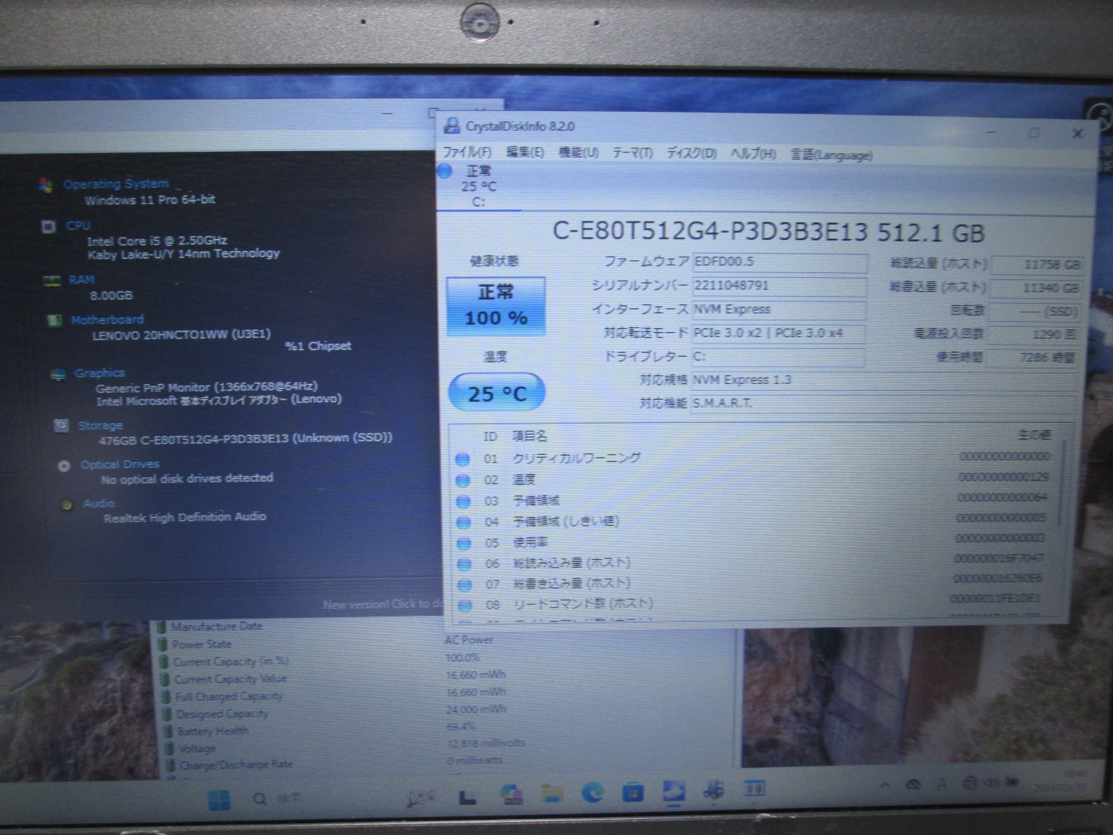 | バッテリー状態 | 新品時と比較して 69% の性能。 (BatteryInfoViewで表示された参考値であり実際の容量・充電可否は保証対象外) |