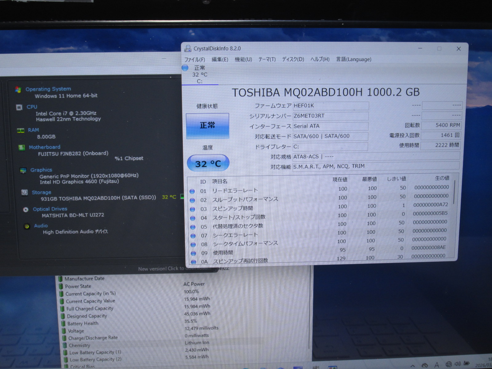 | バッテリー状態 | 新品時と比較して 35% の性能。 (BatteryInfoViewで表示された参考値であり実際の容量・充電可否は保証対象外) |