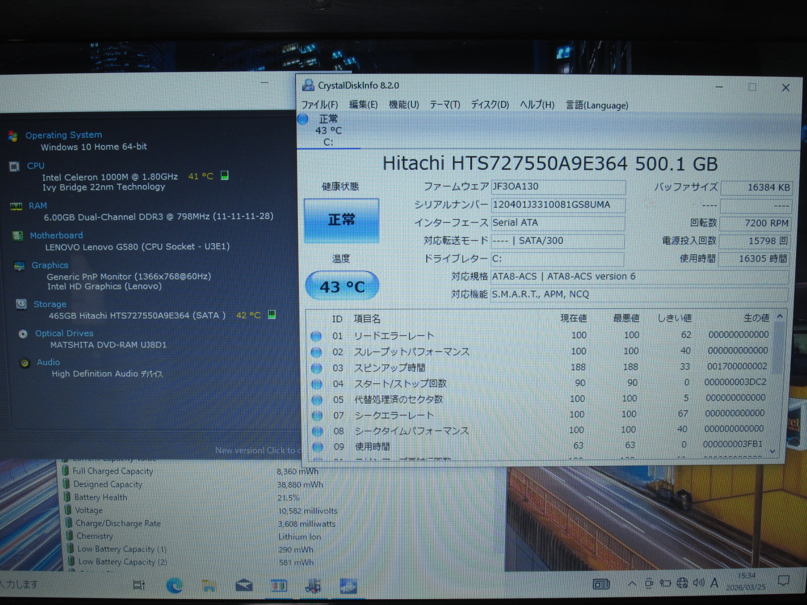 | バッテリー状態 | 新品時と比較して 21% の性能。 (BatteryInfoViewで表示された参考値であり実際の容量・充電可否は保証対象外) |