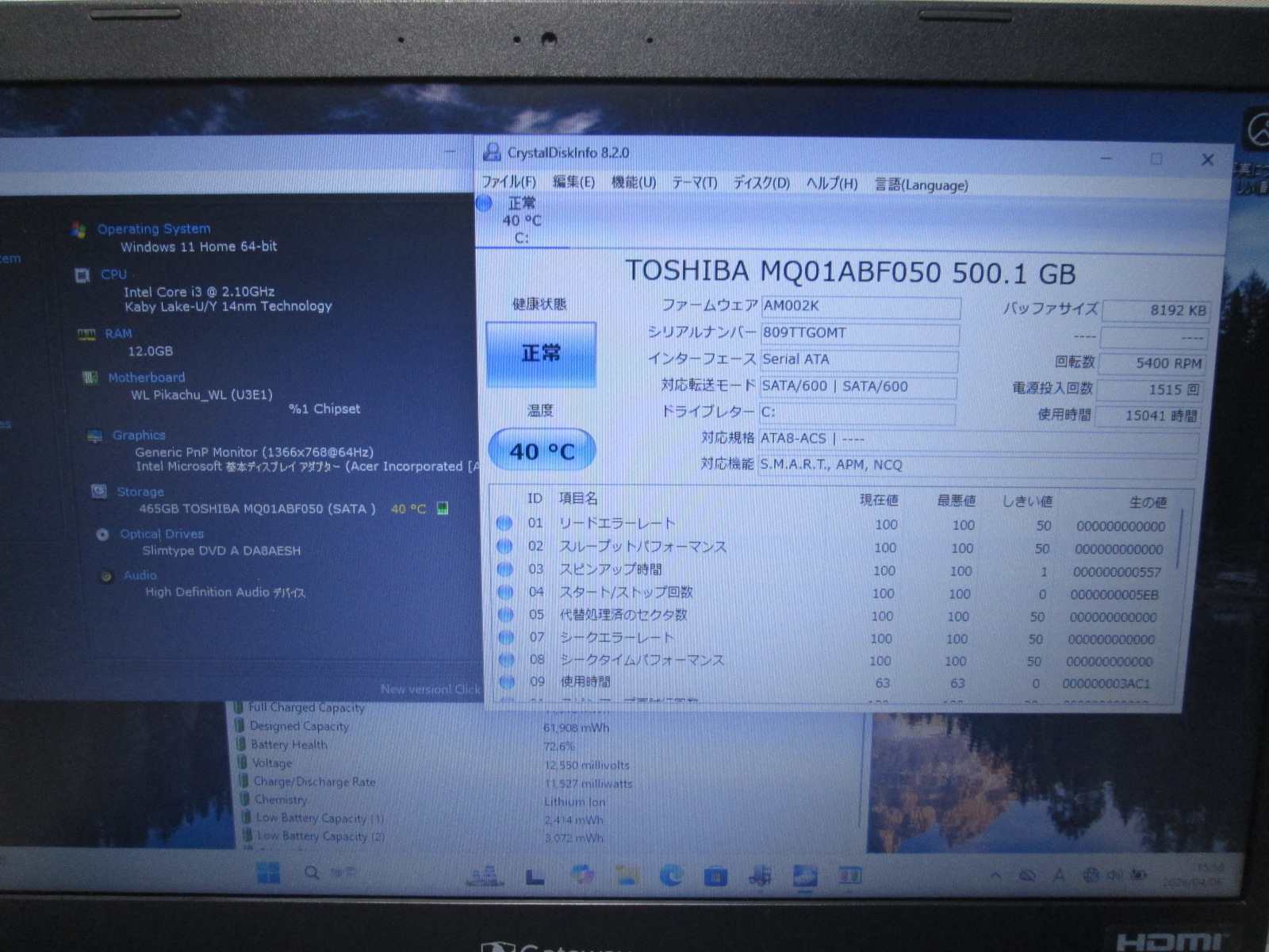 | バッテリー状態 | 新品時と比較して 72% の性能。 (BatteryInfoViewで表示された参考値であり実際の容量・充電可否は保証対象外) |