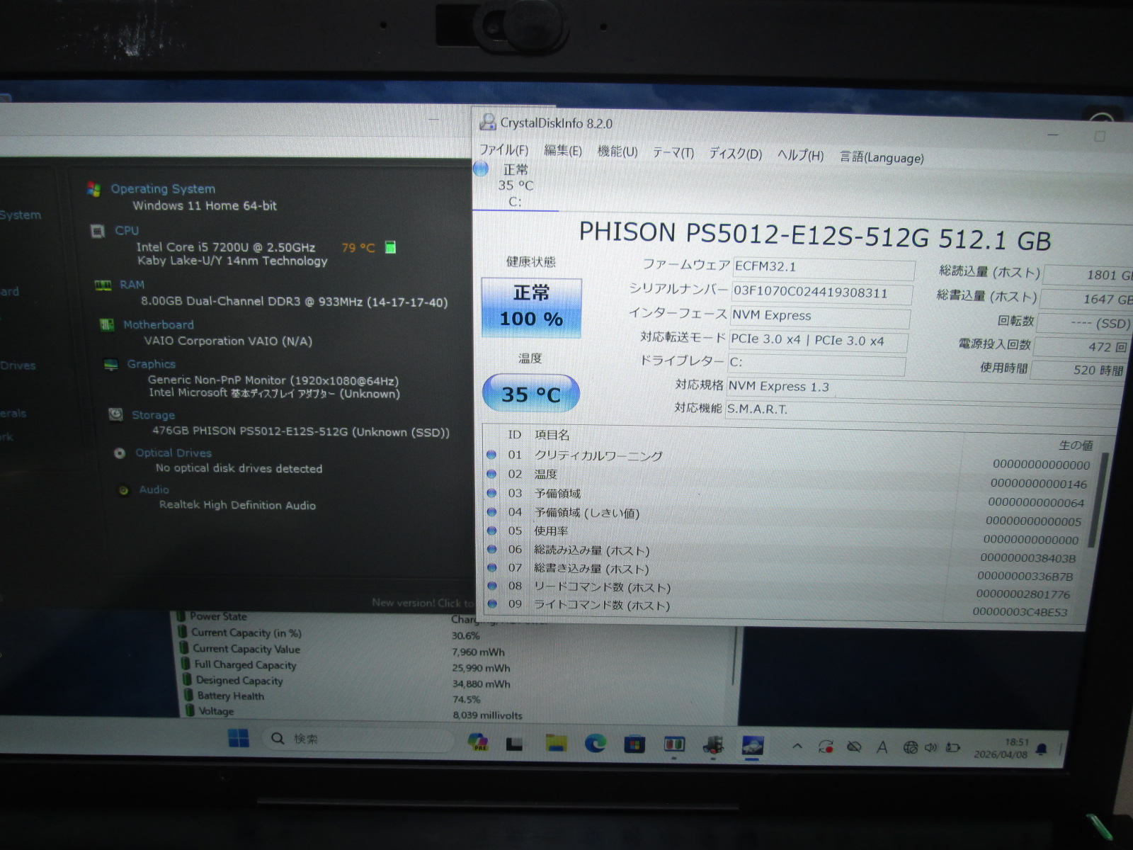| バッテリー状態 | 新品時と比較して 74% の性能。 (BatteryInfoViewで表示された参考値であり実際の容量・充電可否は保証対象外) |