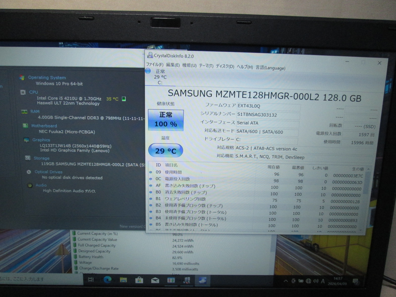 | バッテリー状態 | 新品時と比較して 82% の性能。 (BatteryInfoViewで表示された参考値であり実際の容量・充電可否は保証対象外) |