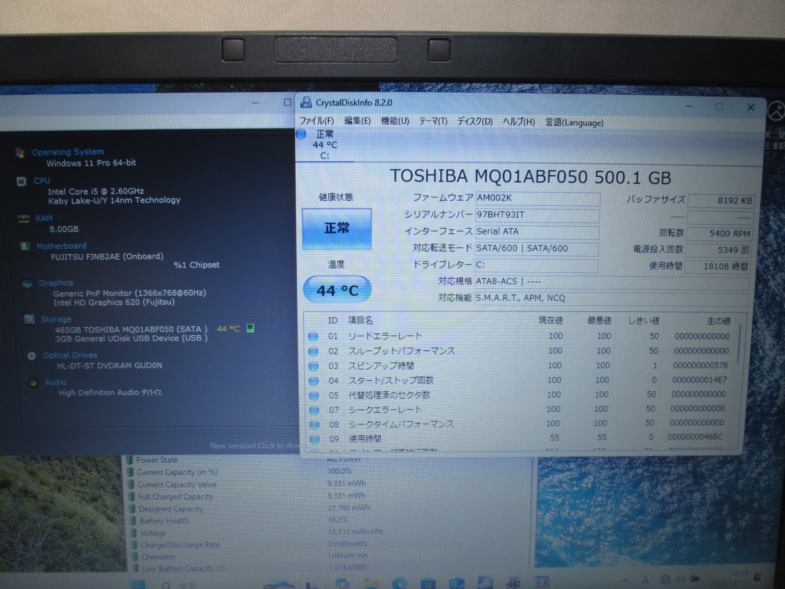 | バッテリー状態 | 新品時と比較して 39% の性能。 (BatteryInfoViewで表示された参考値であり実際の容量・充電可否は保証対象外) |