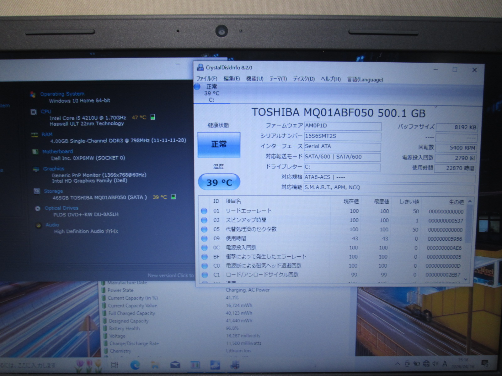 | バッテリー状態 | 新品時と比較して 96% の性能。 (BatteryInfoViewで表示された参考値であり実際の容量・充電可否は保証対象外) |