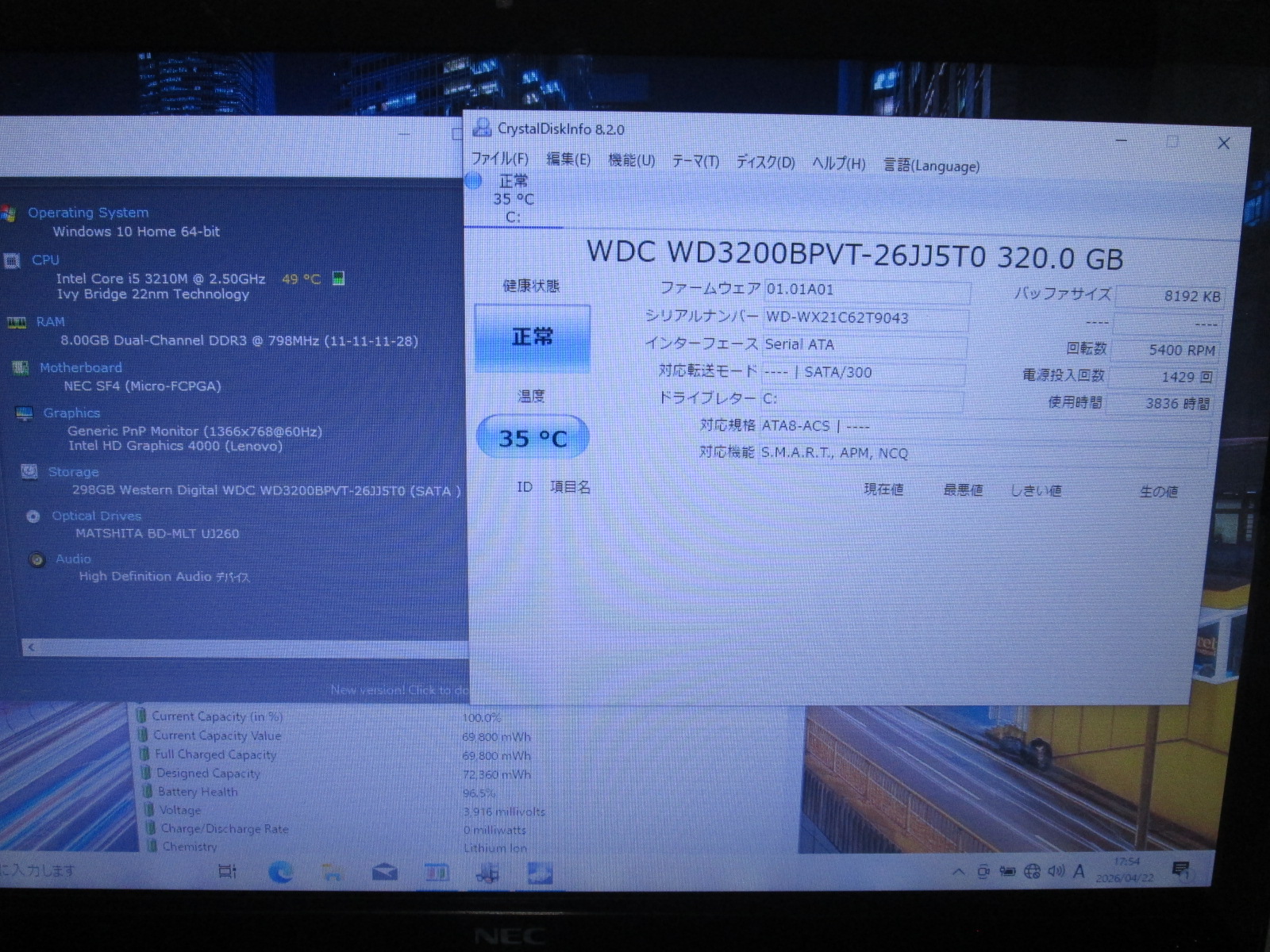 | バッテリー状態 | 新品時と比較して 96% の性能。 (BatteryInfoViewで表示された参考値であり実際の容量・充電可否は保証対象外) |