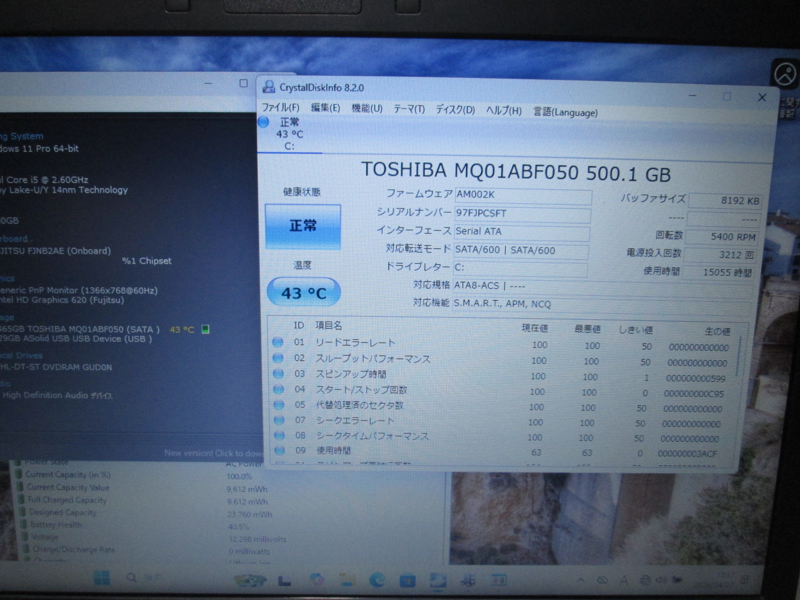| バッテリー状態 | 新品時と比較して 40% の性能。 (BatteryInfoViewで表示された参考値であり実際の容量・充電可否は保証対象外) |