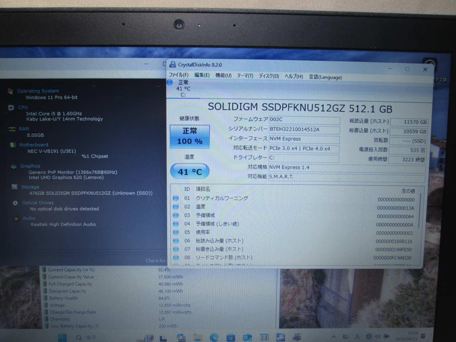 | バッテリー状態 | 新品時と比較して 84% の性能。 (BatteryInfoViewで表示された参考値であり実際の容量・充電可否は保証対象外) |