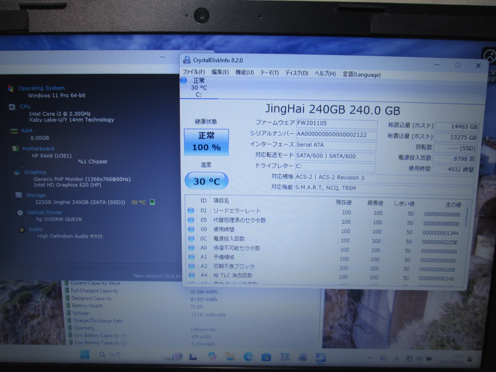 | バッテリー状態 | 新品時と比較して 77% の性能。 (BatteryInfoViewで表示された参考値であり実際の容量・充電可否は保証対象外) |