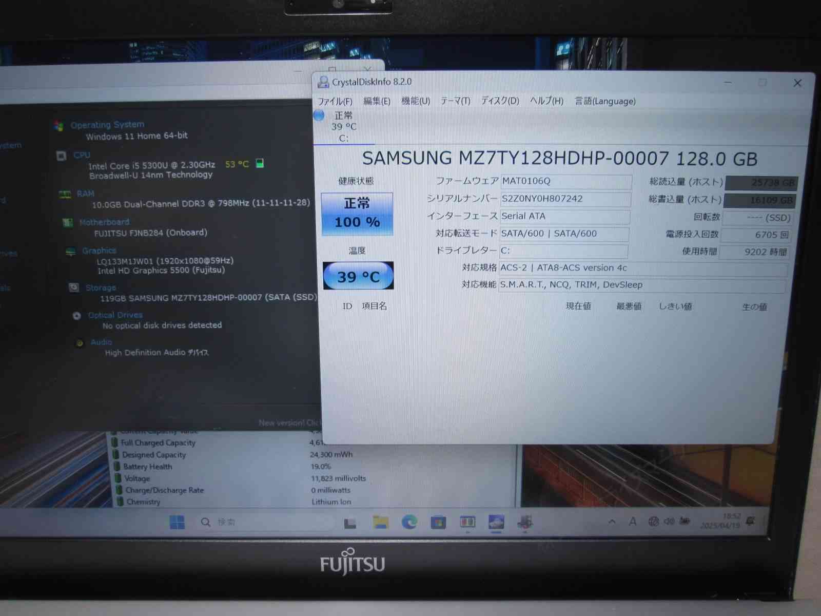 | バッテリー状態 | 新品時と比較して 19% の性能。 (BatteryInfoViewで表示された参考値であり実際の容量・充電可否は保証対象外) |