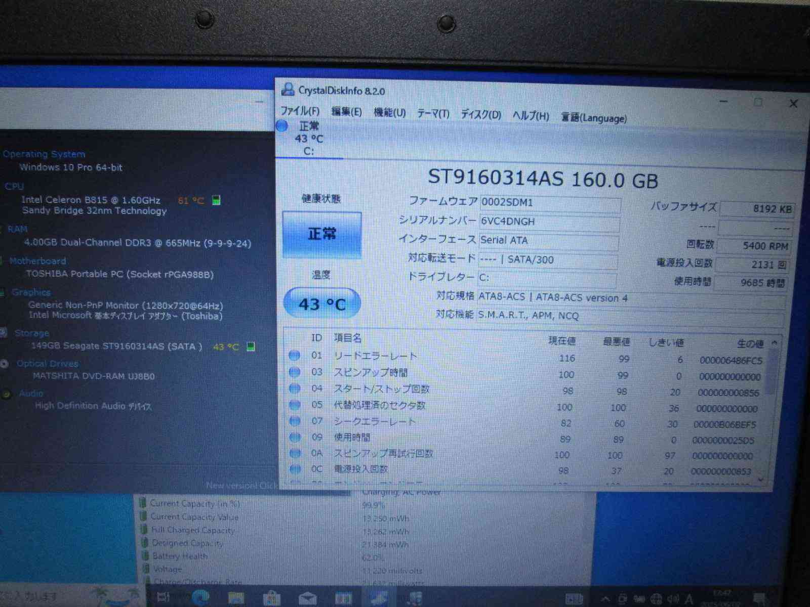 | バッテリー状態 | 新品時と比較して 62% の性能。 (BatteryInfoViewで表示された参考値であり実際の容量・充電可否は保証対象外) |