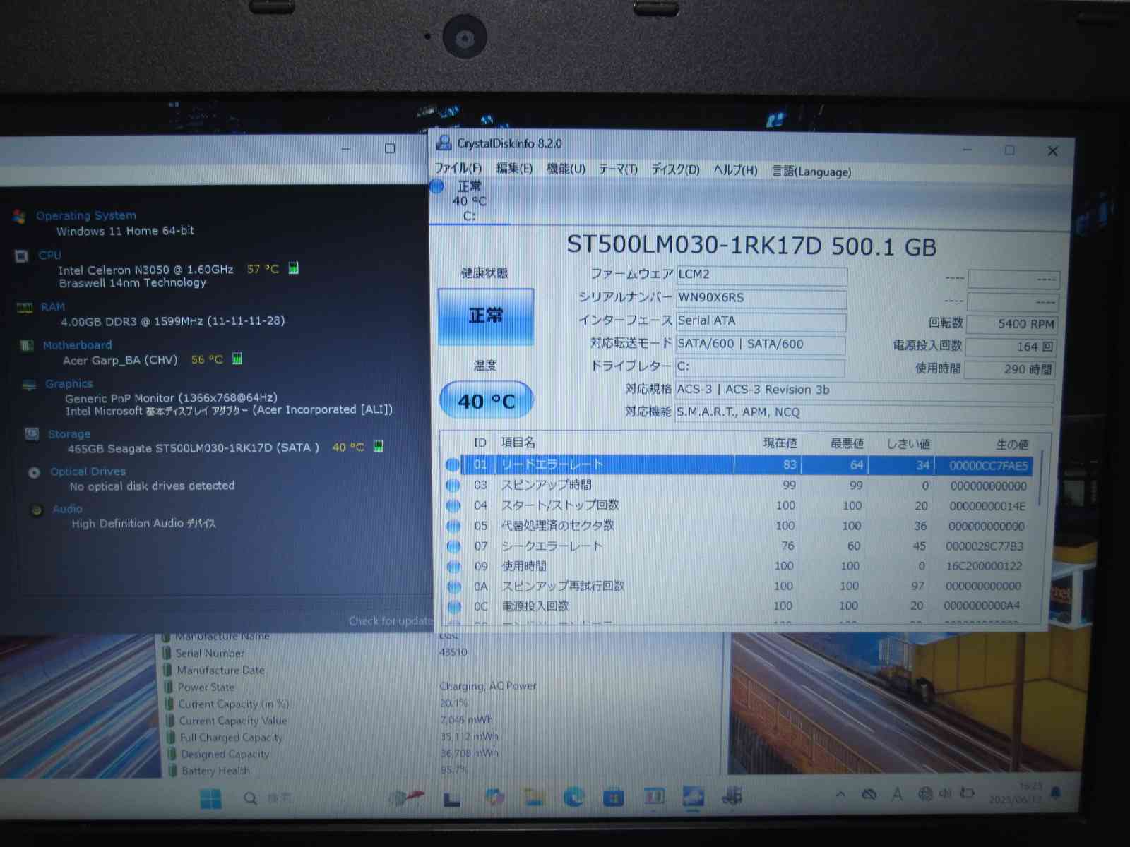 | バッテリー状態 | 新品時と比較して 95% の性能。 (BatteryInfoViewで表示された参考値であり実際の容量・充電可否は保証対象外) |